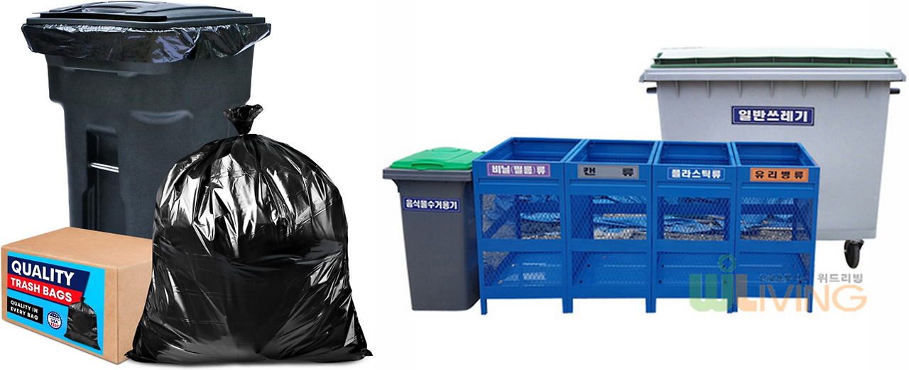 반면에 우리나라에서는 모든 것이 철저하게 구분되어 있다. 종이, 비닐, 캔, 유리, 스티로폼, 플라스틱... 구 마다 종량제 봉투도 다르고 음식물 쓰레기의 종량제도 따로 있다. 또한 페트병을 버릴 때 라벨을 떼어서 비닐에 넣어야 한다.