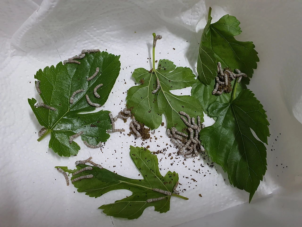 신선한 뽕잎을 먹고 탈피도 두 번한 누에들은 점점 커지고 있는데