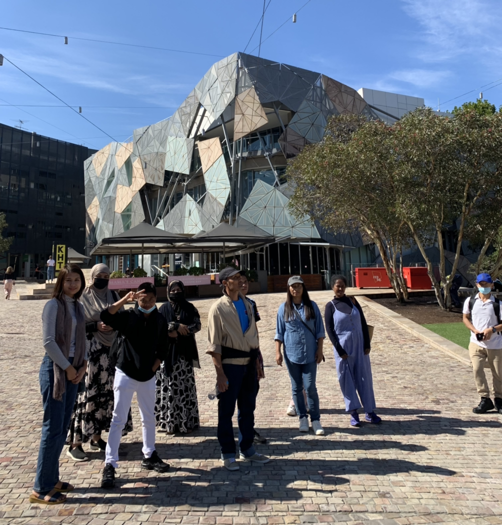 We arrived at the lake and took a breath on the benches, looking over the lake. Under construction? A worker was hanging around the mini greenhouses on the lake's edge. They might have built them to protect young plants until they become strong enough to endure the harsh seasons. Pinky lotus flowers were floating above the dark canvas of the lake water. I called the worker to ask about the way out of the gardens. It was now time to move on. We had a few more places to visit, Federation Square and Queen Victoria Market. We retraced the way to Flinders Street Station, across which Federation Square is located.