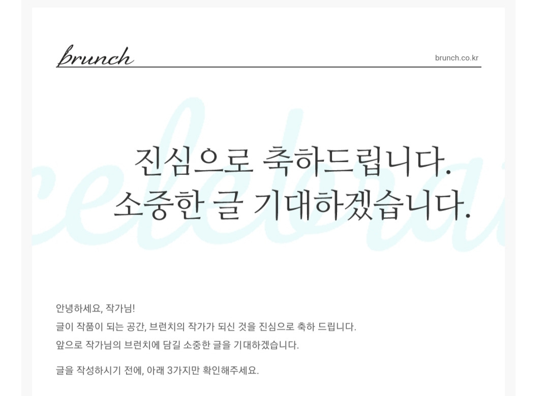 여러 번 브런치 작가 심사에 떨어졌던 만큼 글을 올릴 때 나름 신중을 기했다. 3수 만에 합격했으니까. 무려 '작가님! 축하합니다'란 소리를 들었으니까 말이다.
