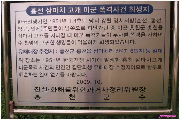 우리는 삼마치 고개를 넘고 있었다. 흰 옷을 입은 사람들이 고개를 가득 메워서 온 산이 하얀 진달래가 핀 것 같았다. 앞서 걷던 사람들로부터 웅성거림이 시작됐다. 서쪽 하늘에서 비행기 엔진 소리가 들려온 것도 그때였다. 우리는 본능적으로 풀숲에 몸을 숨겼다. 미군 비행기인지 중공군의 그것인지 몰랐기 때문이다. 나는 여동생을 품에 안고 잔뜩 몸을 웅크린 채 하늘을 쳐다봤다. 몇 대의 비행기가 사람들을 향해 내려오고 있었다. 흰옷을 입은 사람들이 이리저리 흩어져서 숲 속으로 몸을 숨겼다. 비행기 앞쪽에서 노란 불꽃이 일었다. 낮게 날며 사람들을 향해 기관총을 쏘는 비행기의 꼬리 부분에 미군임을 나타내는 성조기가 선명하게 보였다. 한 남자가 풀숲에서 뛰어나와 비행기를 향해 두 손을 높이 들고 흔들었다. 미군 비행기에게 우리는 적군이 아님을 밝히는 것 같았다. 남자의 앞쪽부터 두 줄의 흙들이 높게 튀어 올랐고 흙먼지가 지난 뒤 남자는 바닥에 힘없이 꼬꾸라졌다.
