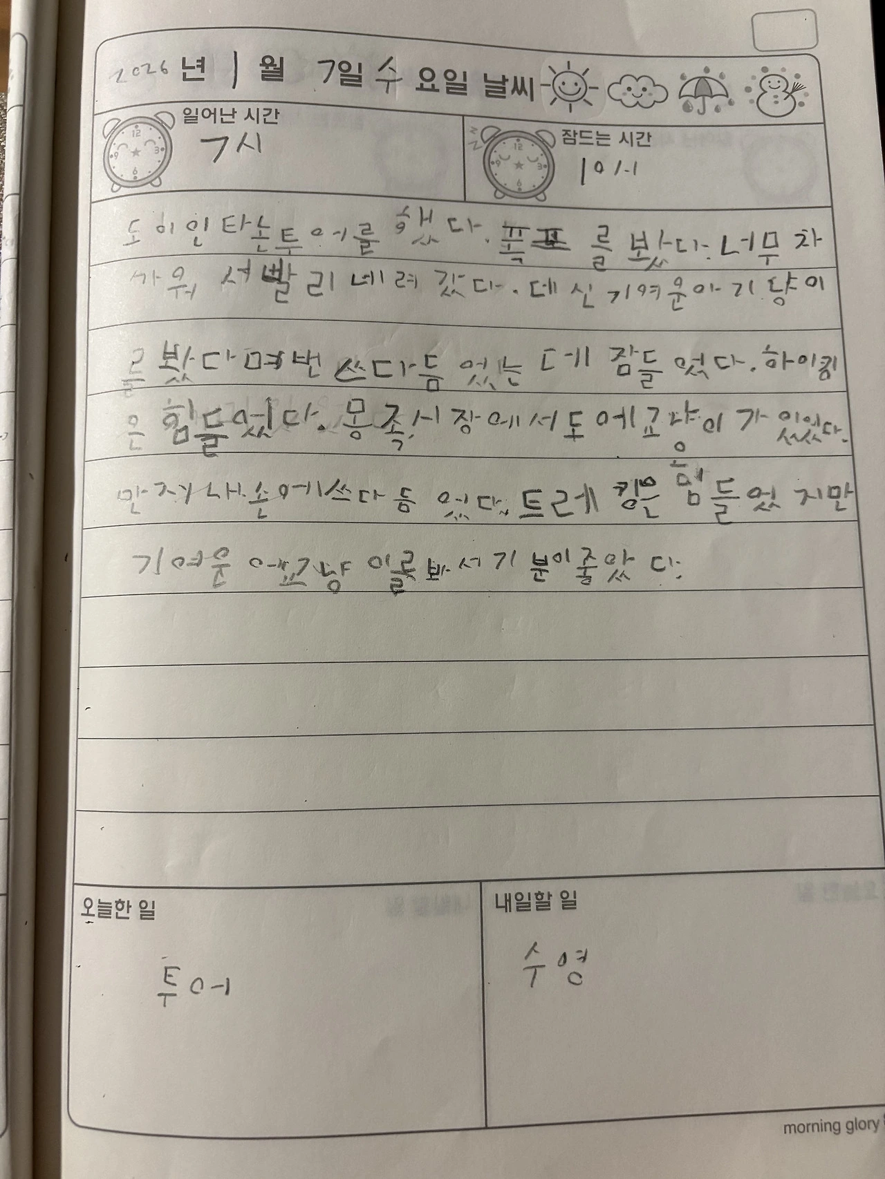 일기를 쓰기 전, 어떤 소재로 무슨 내용을 담을지 아이와 짧게 이야기를 나눈다. 다 쓴 아이가 먼저 일기장을 가져올 때도 있지만, 그렇지 않을 때는 조심스레 읽어봐도 되냐고 묻는다. 가끔 묘사가 좋거나 멋진 표현이 있으면 칭찬을 건네기도 하지만, 대개는 별말 없이 돌려준다. 특히 엉망진창인 맞춤법이나 띄어쓰기는 애써 외면한다. 일기의 목적은 결국 자신의 삶을 반추하고 마음을 들여다보는 데 있기에, 과한 칭찬도 불필요한 지적도 최소화하려 노력한다.