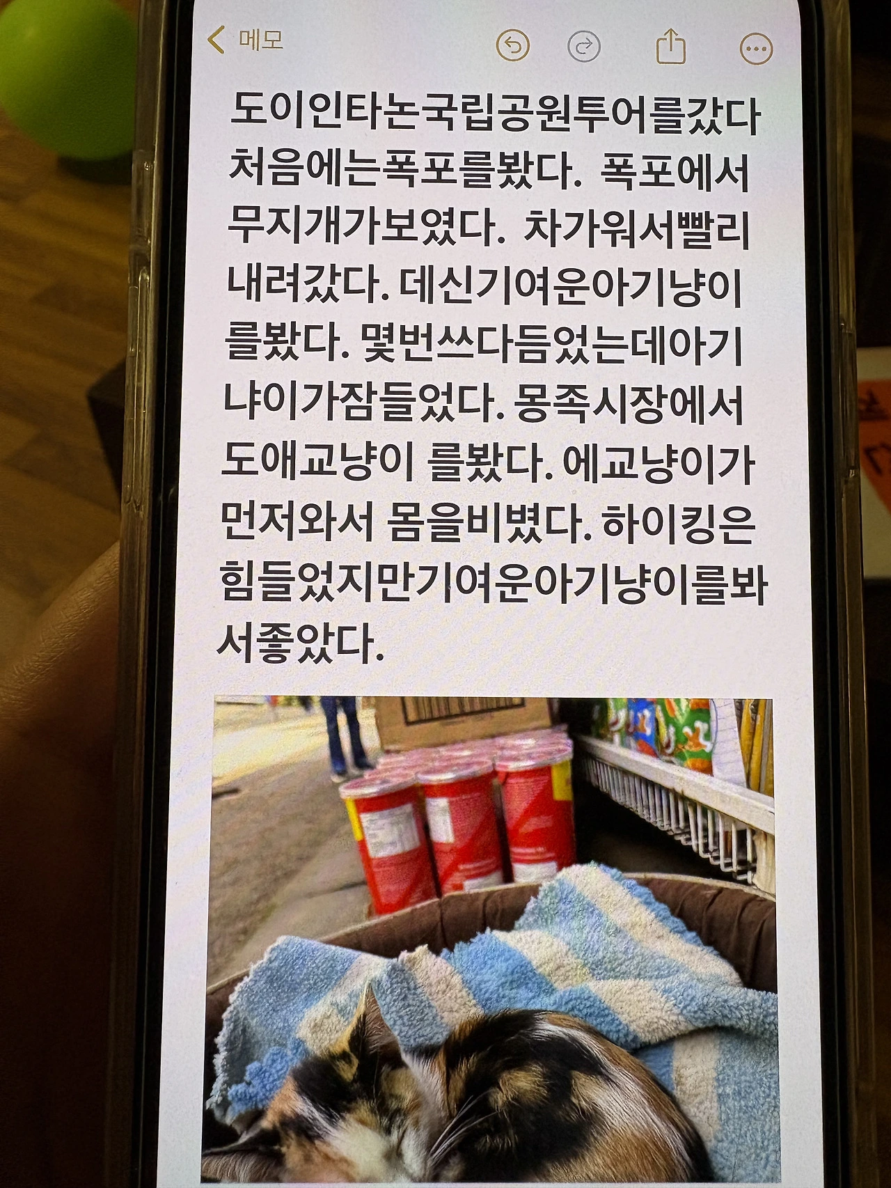 ‘도이인타논 국립공원’과 ‘몽족 시장’은 내가 따로 적어준 걸 보고 쓴 것이다. 사실 트레킹이 하이라이트인 투어였는데, 아들의 일기에는 귀여운 고양이들과의 추억만 가득하다.