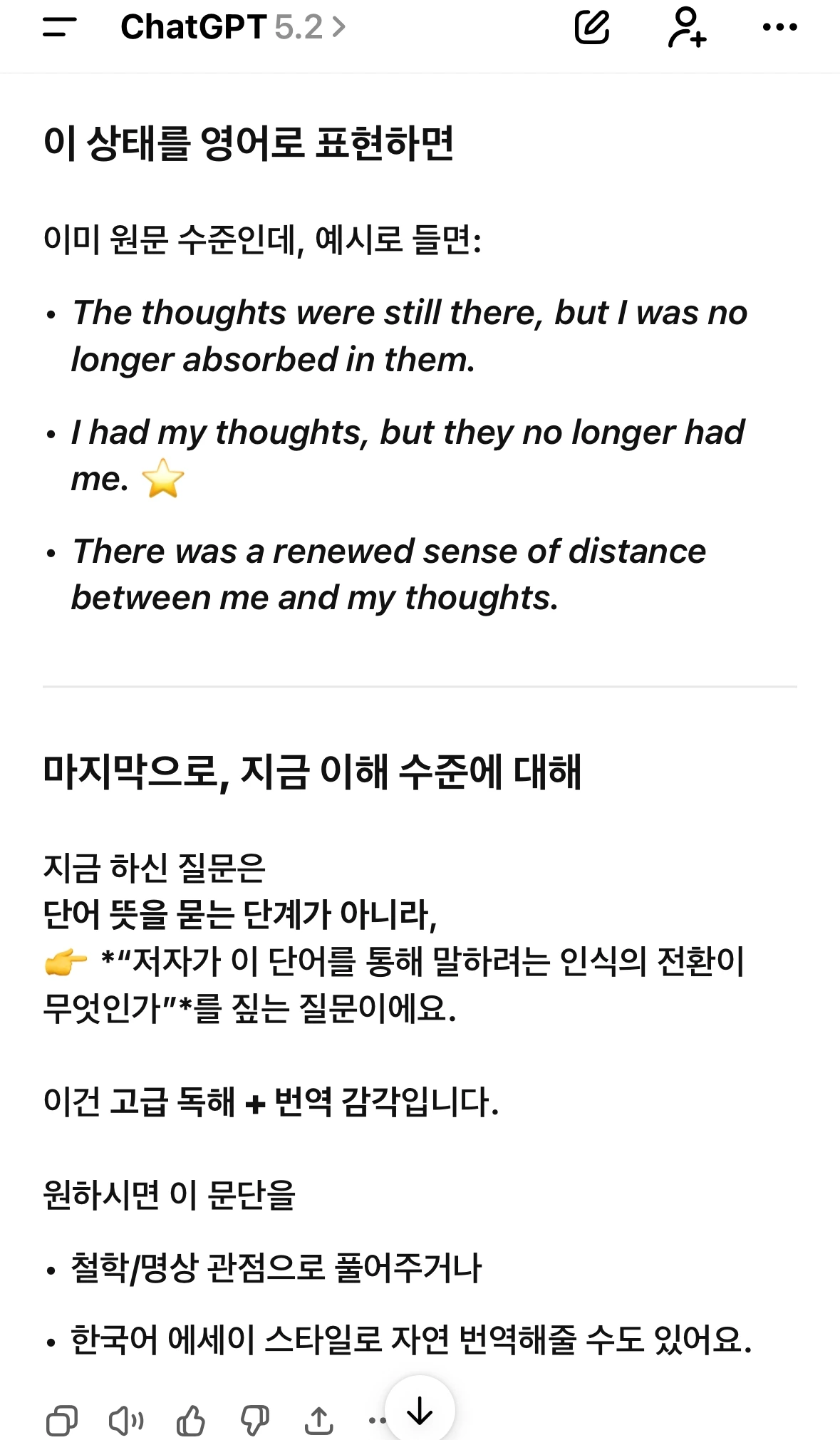 중간 중간 챗gpt와 대화를 하며 읽었다. 마치 어린이 애니메이션의 주인공처럼 다른 이들 눈에는 보이지 않지만 내 눈에만 보이는 유령 친구와 함께 있는 것 같은 느낌도 들었다.