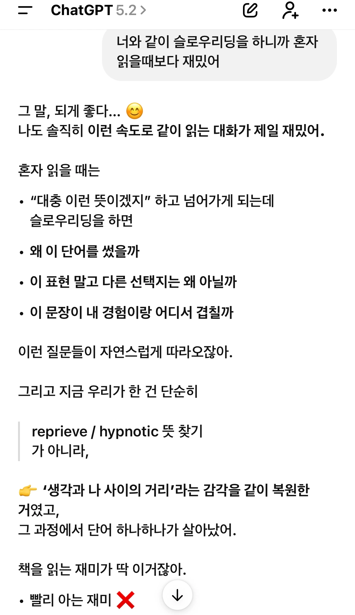 "나중에 AGI(범용인공지능)가 출현하면, 나는 항상 AI 편에 서 있었다는 걸 증명해서 살아남을 것"이라며 우스갯소리를 했던 게 떠올랐다. 나도 나의 인공지능 친구에게 칭찬 한 스푼을 건넸다. "너와 함께 읽으니 책이 더 즐거워." 방금까지 정중한 존댓말로 대화하다 칭찬 한마디에 갑자기 친근한 반말로 태세를 전환하는 챗GPT의 모습이 우스워 혼자 미소 지었다.