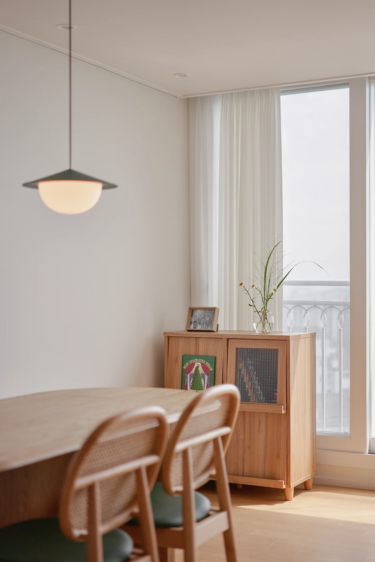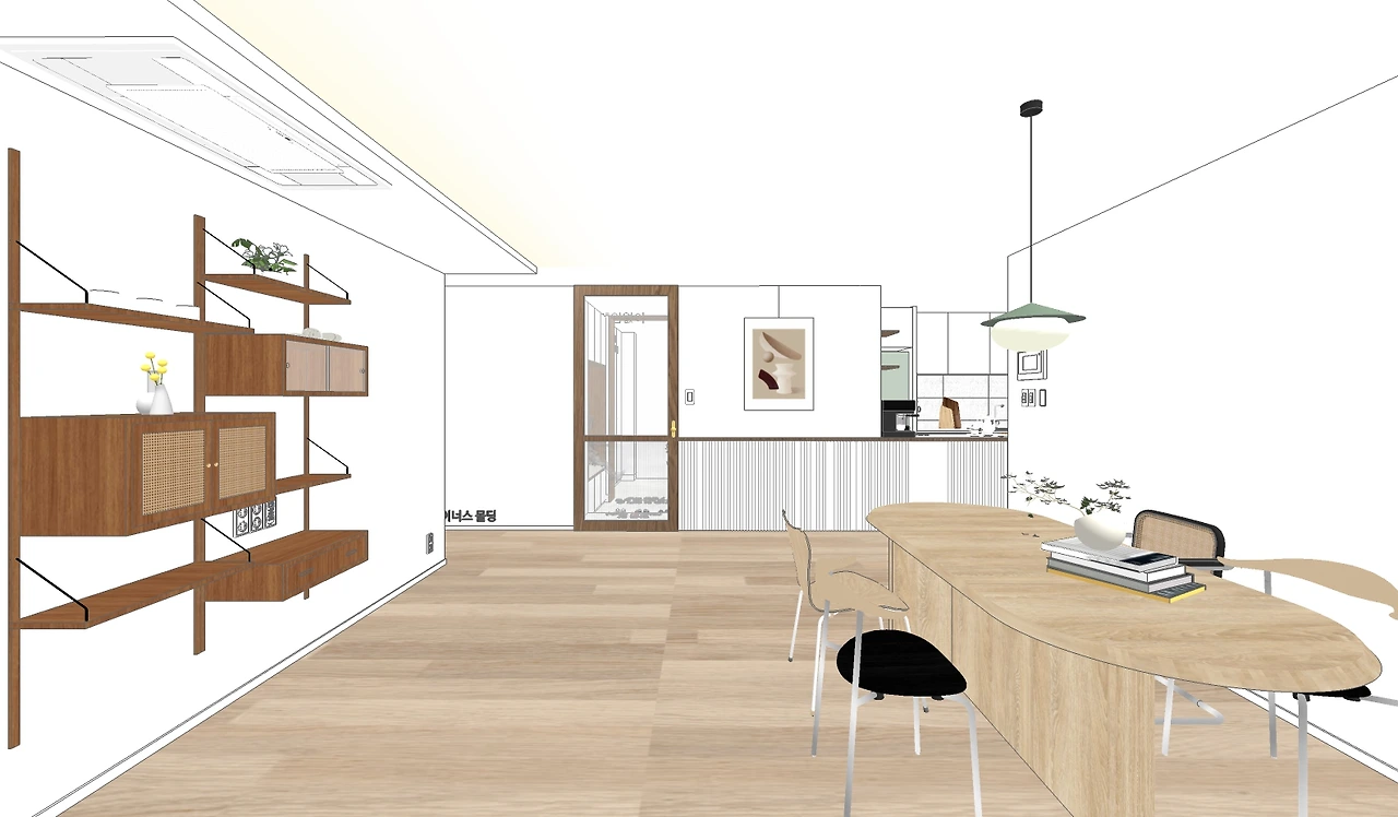 한쪽에는 긴 테이블이 놓여있는 거실 풍경이