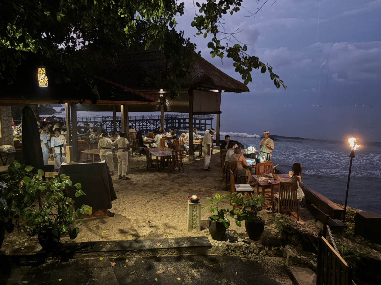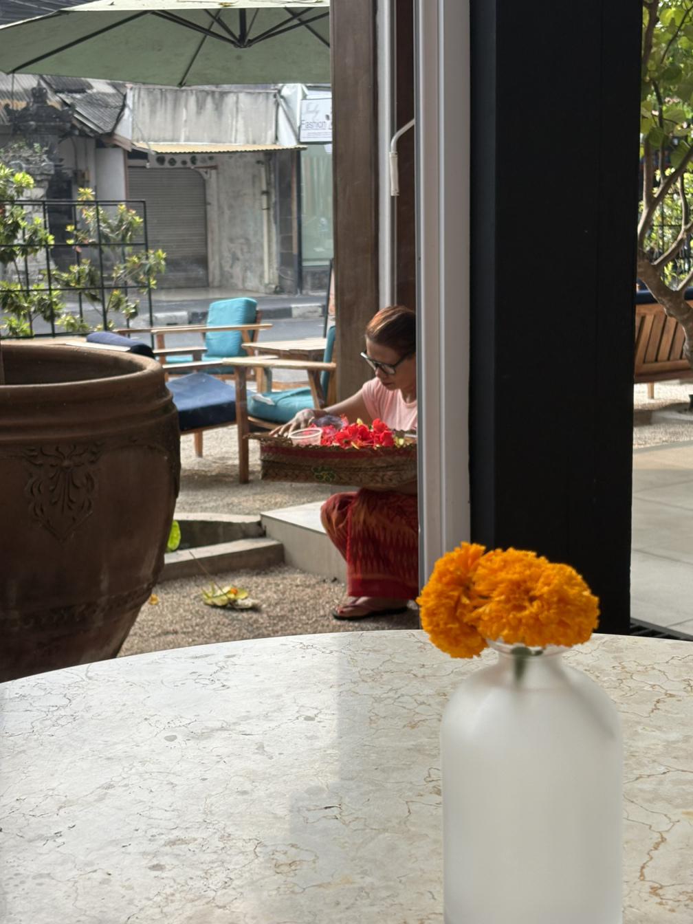 다행히 무시무시한 가격을 정신 승리로 이겨낼 만큼 분위기나 음식 맛도 좋았고 무엇보다 서버들이 너무 친절했다. 사누르에 있다가 왔다고 했더니 자기 집이 바로 그 근처라며 환하게 웃는데, 보는 사람도 행복해지는 미소였다. 고급 리조트라 당연히 서비스 교육을 엄청 받았겠지만, 발리 사람들의 친절과 미소는 좀 남다르다. 서비스를 제공한다고 해서 모든 사람들이 발리 사람들 같은 웃음을 지어주진 않으니까. 베트남 출장을 자주 가는 남편도 말했다. 여기 사람들의 미소는 진정성이 느껴진다고. 테니스 레슨에서 만났던 현지인 친구의 말이 떠올랐다. 확실히 발리 사람들은 치열하게 경쟁하고 스트레스를 받는 삶과는 거리가 멀다고 했다. 매일 아침 찬당 사리(Canang Sari)를 신들에게 바치며 감사한 마음으로 하루를 시작하는 사람들의 얼굴에는 고스란히 그들의 넉넉한 삶의 태도가 담겨있다. 고급 리조트에 있든, 4만 원짜리 숙소에 있든 발리 사람들의 얼굴과 목소리는 다정하고 따뜻하다.