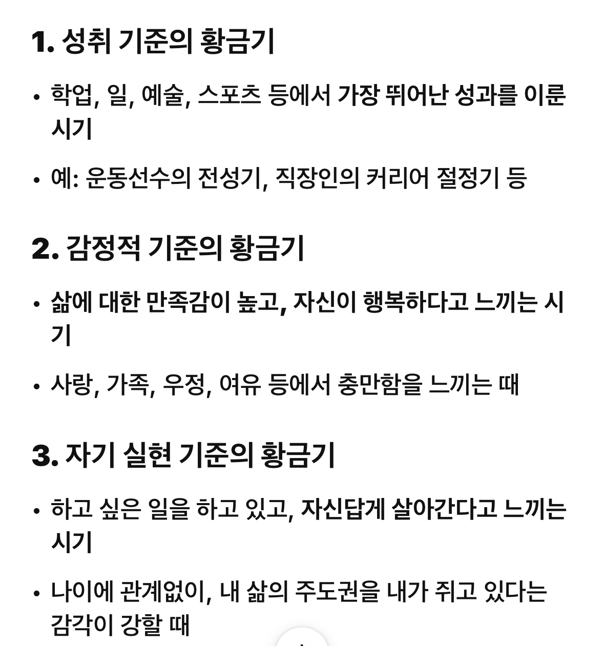 내가 인생의 황금기를 잘 못 정의하는 건 아닌가 싶어 ChatGPT에게도 물어봤다. 지금이 내 인생의 황금기라고 말하지 못할 이유가 없다.