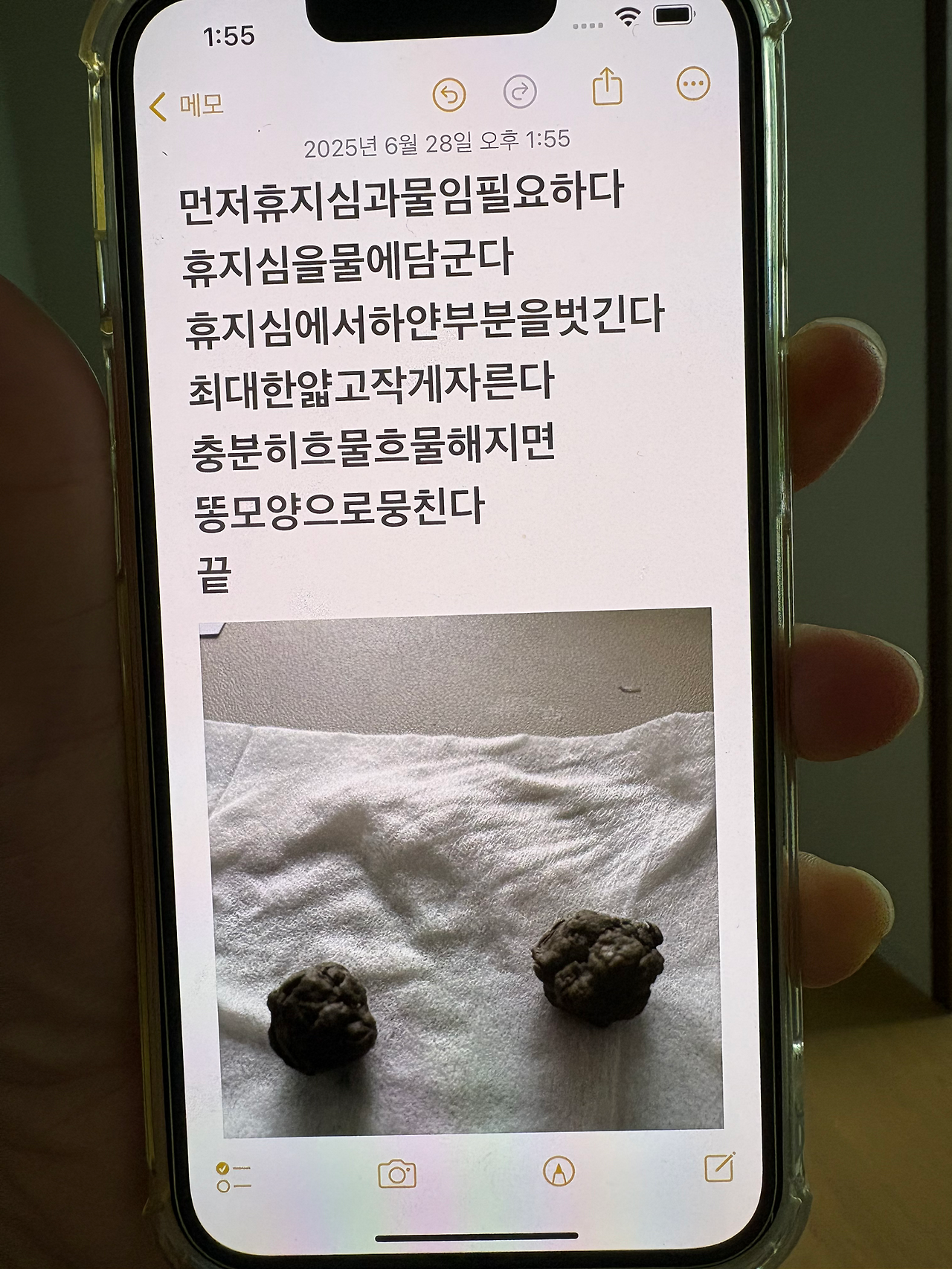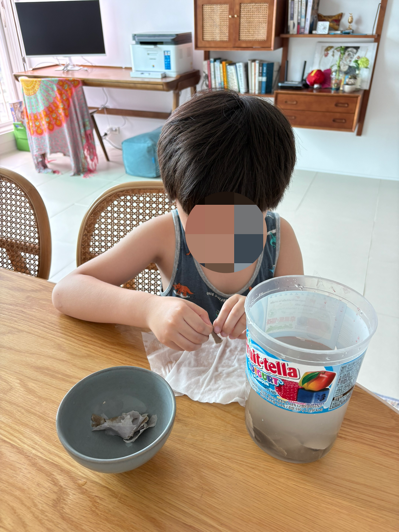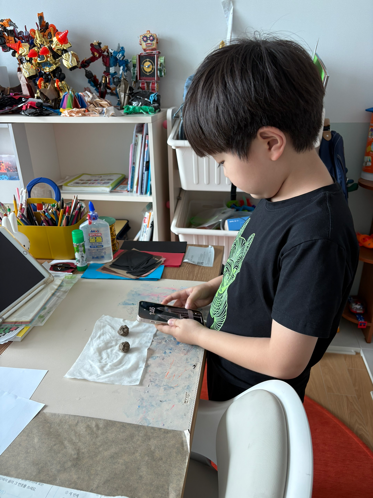 한 시간이 지나도 휴지심은 뭉치기에 적당한 정도로 흐물흐물해지지 않았다. 친구에게 그 녀석의 만행이 끼친 후폭풍을 보여주려고 사진을 보냈더니, 다음 날 그 녀석이 답장을 했다. 휴지심에서 흰 종이를 분리해야 진짜 똥처럼 보인다고. 그런 키포인트는 진작 말해줬어야지! 휴지심을 산산조각 낸 터라 일일이 떼어내려면 손이 많이 들었다. 왜 지금 내가 이걸 하고 있는지 도무지 알 수 없는 엄마와 달리, 아들은 귀찮다는 말 한마디 없이 신중하게 물에 젖은 휴지심 조각에서 흰 종이를 떼어냈다. 여전히 뭉치기에는 종이가 조금 두꺼워서 갈색 종이를 여러겹으로 벗겨냈다. 그리고 마침내 몇 시간 뒤 아들은 그렇게 원하던 똥 두덩어리를 손에 넣었다. 환희에 가득찬 표정으로! 이 두덩어리를 얻기 위해 오전 내내 얼마나 공을 들였던가! 그림책을 스무권은 읽을 수 있는 시간이며 수학문제집 수십장을 풀 수 있는 시간이다. 그 소중한 시간을 오로지 똥을 만드는 데 쏟아부었다.