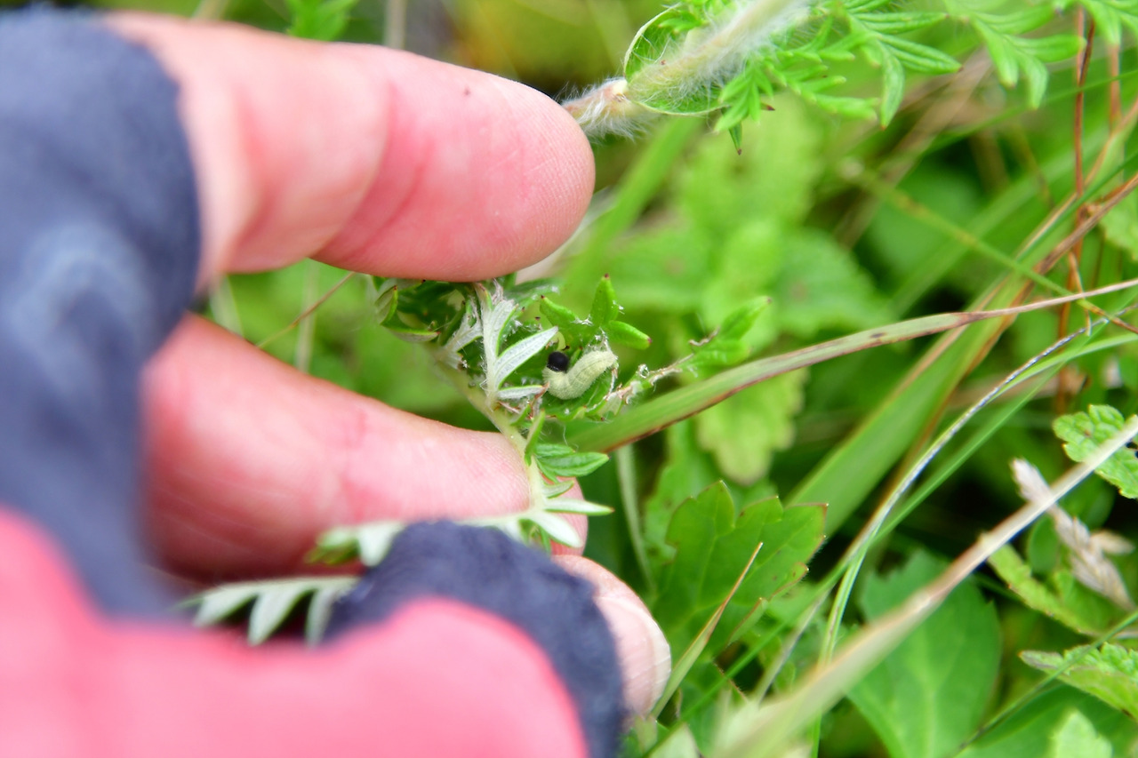 숲길이 열리며 촘촘한 억새 사이를 비집고 자라고 있는 딱지꽃을 발견하자 혹시나 하는 맘으로 이파리를 살펴보았다. 다행히 어렵지 않게 애벌레를 찾을 수 있었다. 학생들 입에서 ‘역시!’하는 감탄이 쏟아졌다. 흰점팔랑나비는 봄에는 양지꽃, 여름에는 딱지꽃에 알을 낳고 기주 식물(애벌레 먹이식물) 주변에는 어느 정도 흙이 노출되어 있는 공간이 있어야 한다. 게다가 알을 한 곳에 많이 낳기보다는 장거리를 이동하면서 드문드문 낳기 때문에 초원 경관이 거의 사라진 일본에서는 멸종에 이를 수밖에 없는 행동 패턴을 가지고 있다. 생물 보전지구를 만들 때는 여러 개의 작은 패치(조각난 경관)보다 적은 수의 큰 패치가 개체군을 유지하는데 유리하기 때문이다.