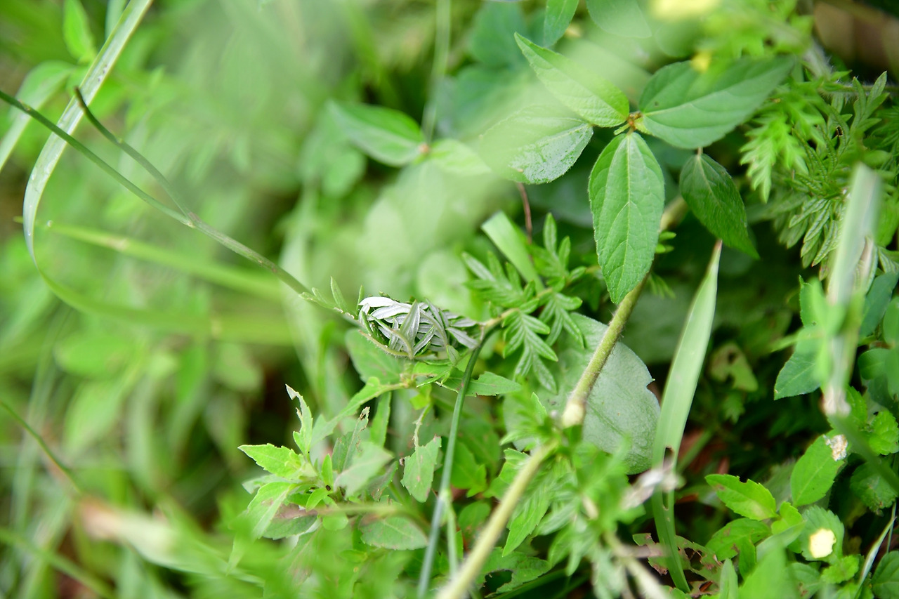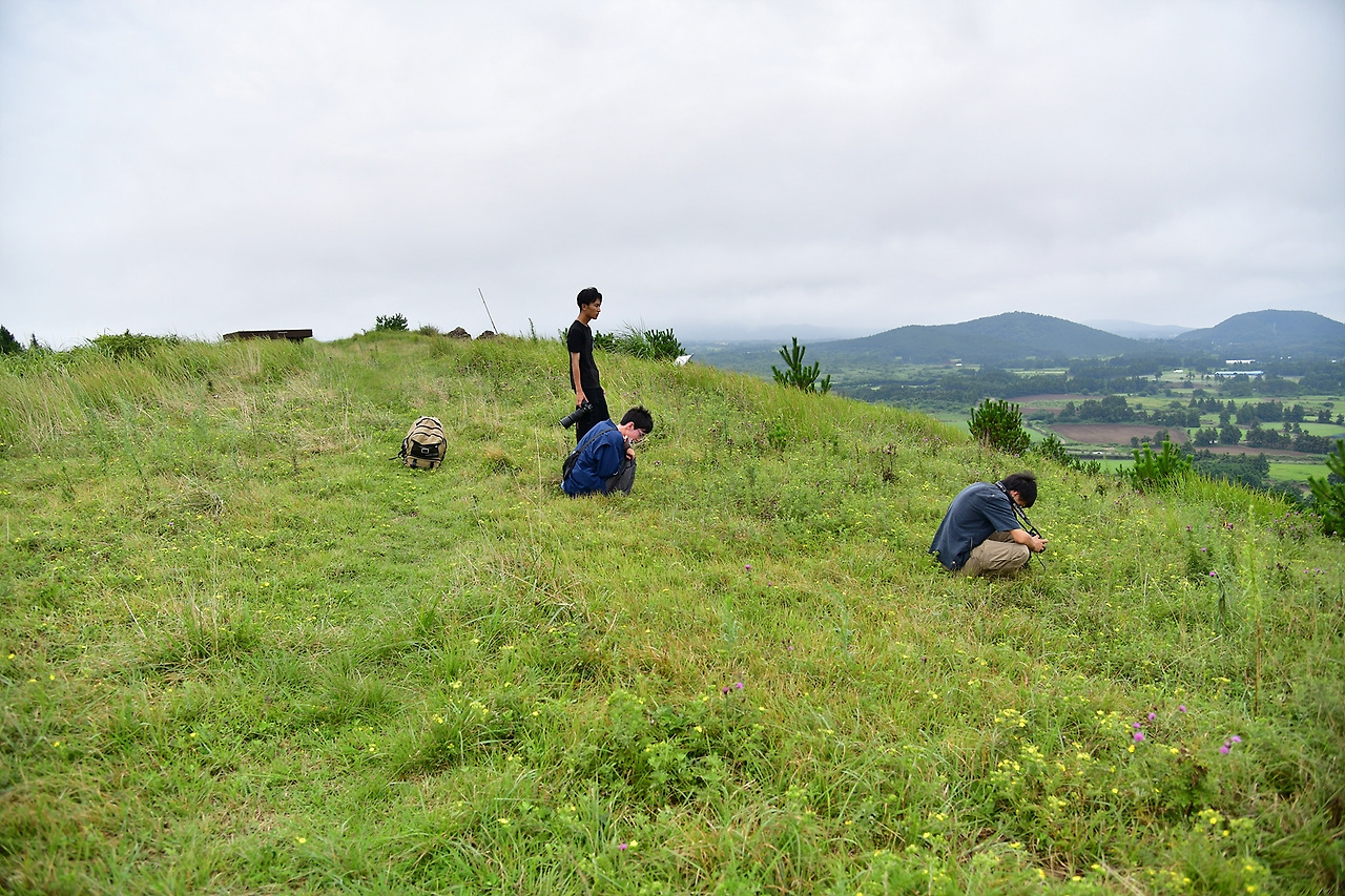 나카무라씨가 부탁한 청년들과 함께 원물오름에 올랐다. 흰점팔랑나비 애벌레를 확인할 수 있는 곳을 물어왔던 터라 4월과 6월에 애벌레를 확인했던 곳을 찾은 것이다. 원물오름은 2년쯤 전까지 말을 방목했던 곳이었고, 오름 능선에 남아 있는 무덤, 수서곤충을 관찰할 수 있는 연못이 있다는 설명을 하면서 좁고 미끄러운 숲길을 십여 분 올랐다.