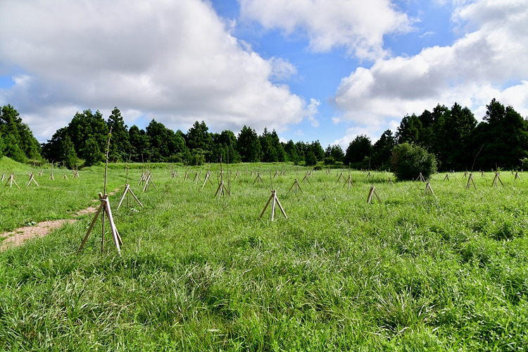 4월에 왔을 때는 아직 이른 봄이라 그런가 보다 했습니다. 깡마른 줄기에 사방으로 늠름한 부목이 받치고 있는 것이, 언제 여기다 나무를 심었을까 하는 의문과 더 이상 영주산에서 방목을 하지 않기로 했나 보다라는 짐작을 할 수 있었지요. 찬찬히 들여다보니 한 줄에 대략 13그루인데 살아있는 나무가 많아야 6그루, 적게는 3그루 정도밖에 되지 않습니다. 언뜻 보기에도 살아있는 나무가 채 50%도 되지 않아 보였지요. 이파리를 보니 산딸나무입니다. 산지관리법령에서 어린나무(치수 稚樹)는 가슴높이 지름이 6cm 미만을 말하는데, 줄기만 남은 나무들은 딱 봐도 어린나무들입니다. 옮겨 심은 200여 그루 나무 중 절반 이상이 꽃 한 번 피워보지 못하고 죽고 말았습니다. 육지에는 산불과 산사태로 나무가 죽고 숲이 무너지는 뉴스로 시끌벅적하거늘 우리는 어린나무들을 심어놓고 죽게 하고 있다니.