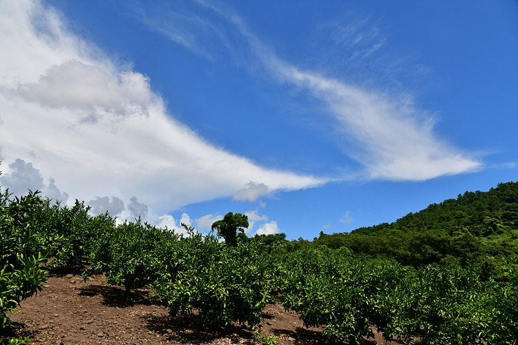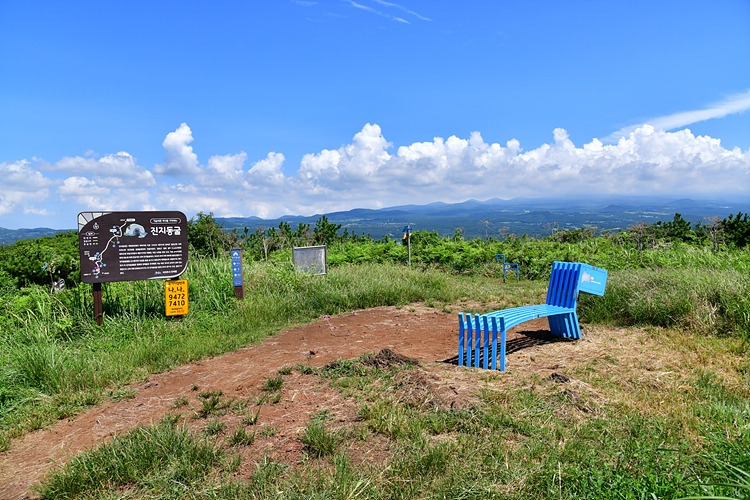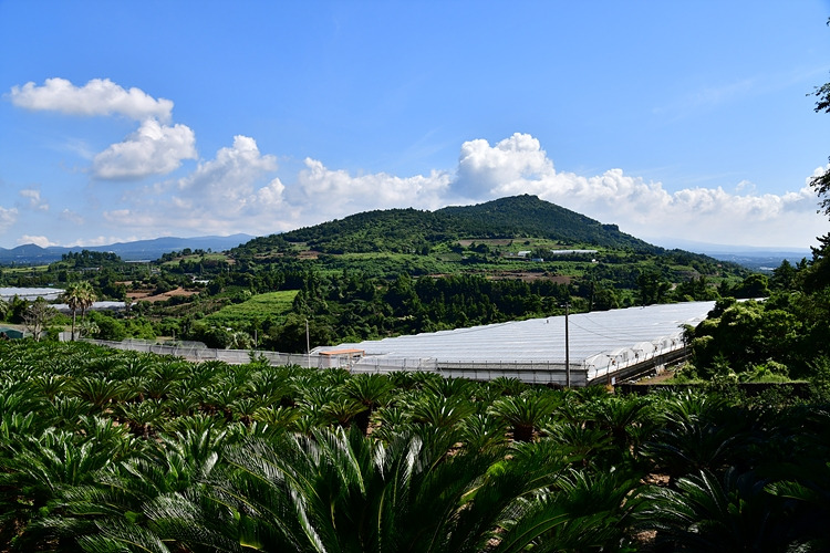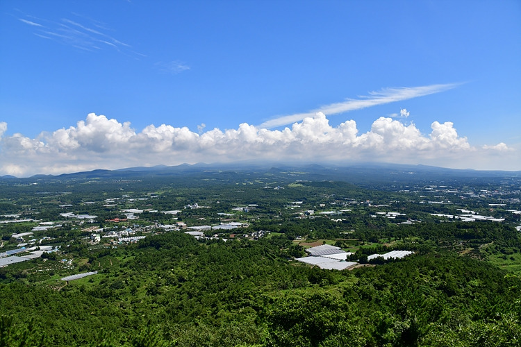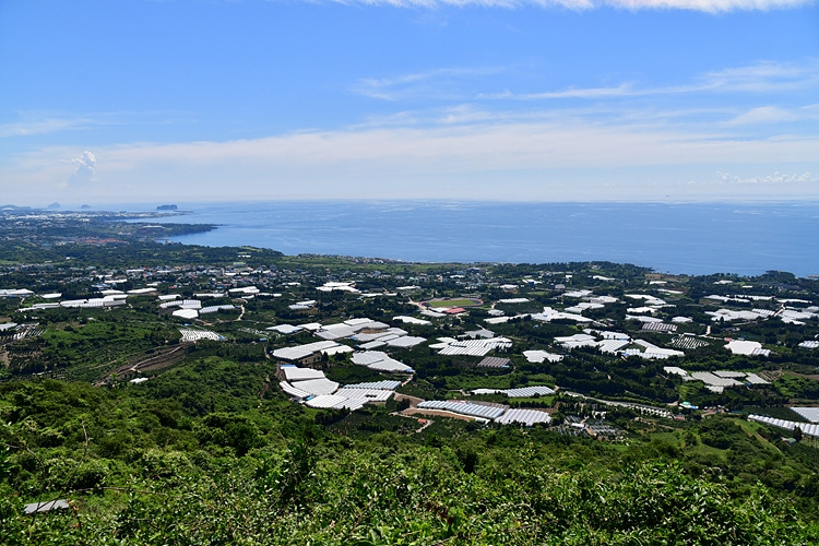 군산오름 정상 절벽 바위에서는 멀리 동쪽으로는 범섬, 문섬, 섶섬에서부터 남쪽 끝 마라도와 가파도까지 파노라마가 이어진다. 오름 정상에 길게 누운 올레 ‘간세’도 개성 넘치고 한라산 정상을 완벽히 가려버린 흰 구름 띠와 마을의 반은 하얀 비닐하우스 지붕으로 덮여있는 모습도 이색적이다. 비닐하우스가 이렇게도 많다니, 저 안은 얼마나 더울까? 상상하지 말자.