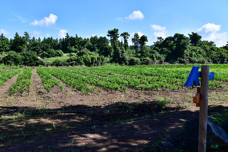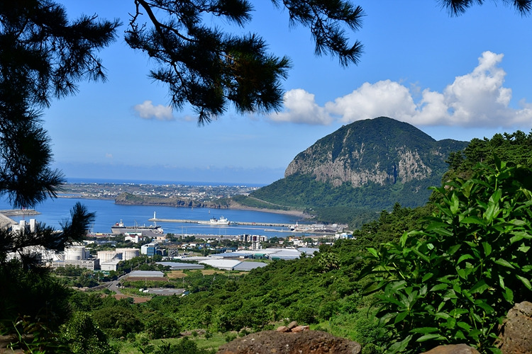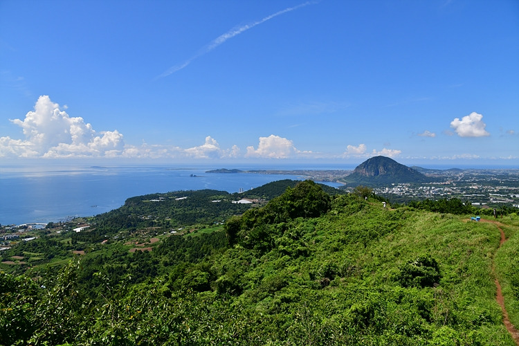 이어지는 월라봉 숲길과 밭 사이로 난 길에서 길냥이와 인사를 나누고, 간간이 올레 리본을 확인하다 하늘이 열리는 그늘에서 잠시 쉬어간다. 아무래도 오늘은 그늘마다 쉬어가야 할 것 같다. 투박한 산방산 너머로 야트막한 송악산까지 이어지는 해안 마을이 눈에 들어온다. 바다, 절벽 바위, 섬 그리고 하늘 모두 시야가 맑다. 군산오름 숲으로 들어서기 전에 충분히 눈에 담아둬야 한다. 이 더운 날 사서 고생하는 낙은 ‘산과 하늘과 바다의 푸르름 감상’을 위해서이다.