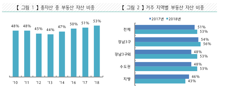 보고서의 대상은 은행 PB룸을 이용하는 금융자산 10억이상 고객을 대상으로 했습니다. 말이 금융자산이지 현찰 10억이상 소유한 사람들이죠. 이 사람들의 평균 자산은 133억원이고, 가구당 연간 소득은 4.5억원. 그리고 흥미로운 점은 부동산 자산 비중이 절반이 넘어간다는 점입니다. 부동산 가격 상승 덕분인지 18년은 53% 역대 최고치고, 강남3구와 지방의 격차가 더 벌어졌습니다.
