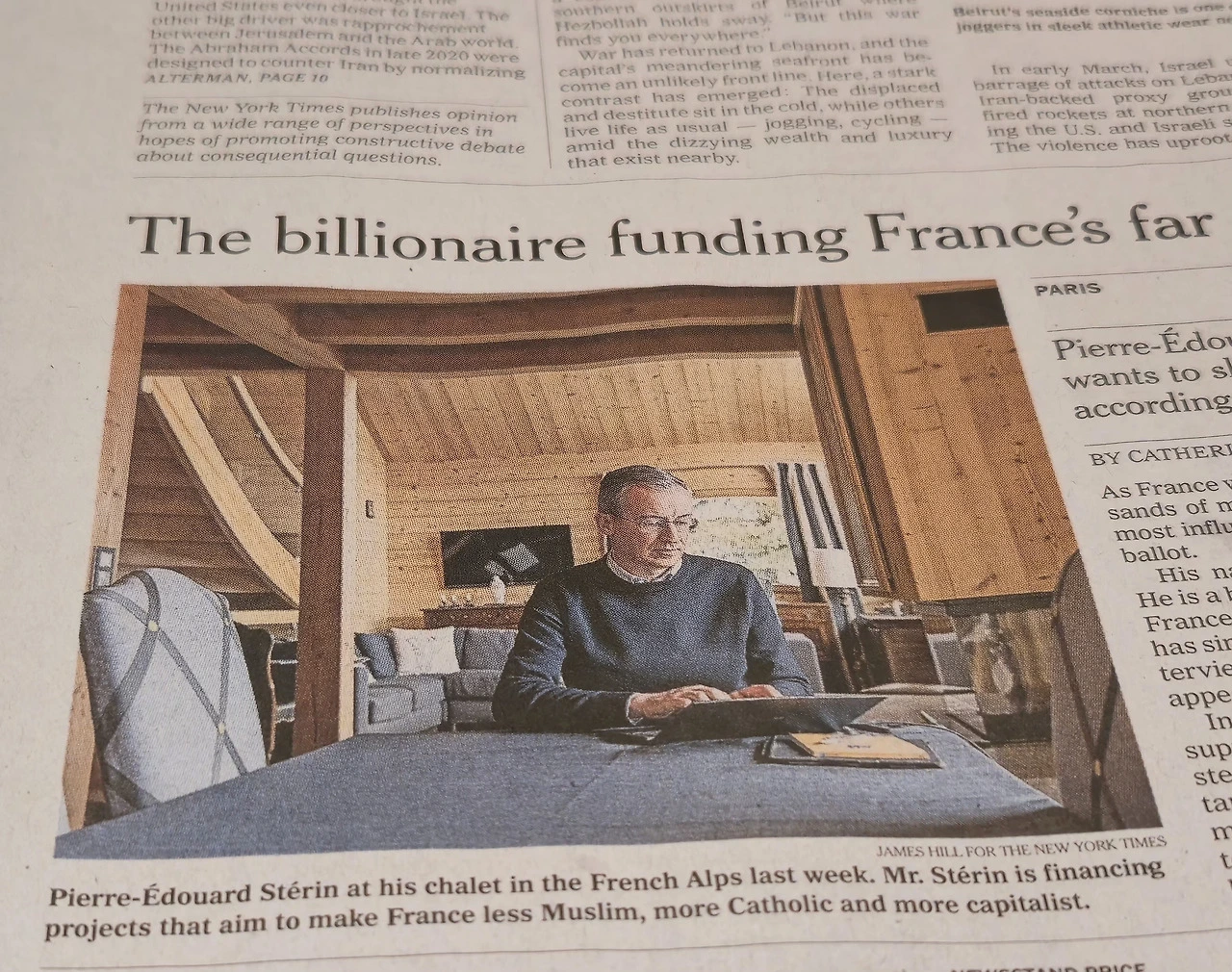 < 지난주 프랑스 알프스 지역 그의 별장에 있는 스터린의 모습. 그는 프랑스를 덜 이슬람적, 더 가톨릭적, 더 자본주의적인 나라로 만들려는 프로젝트들에 투자하고 있습니다. >