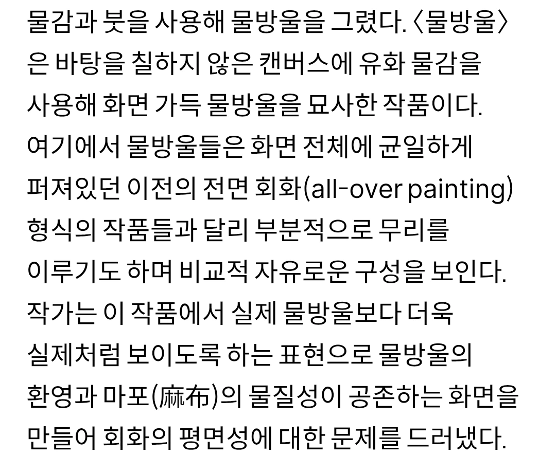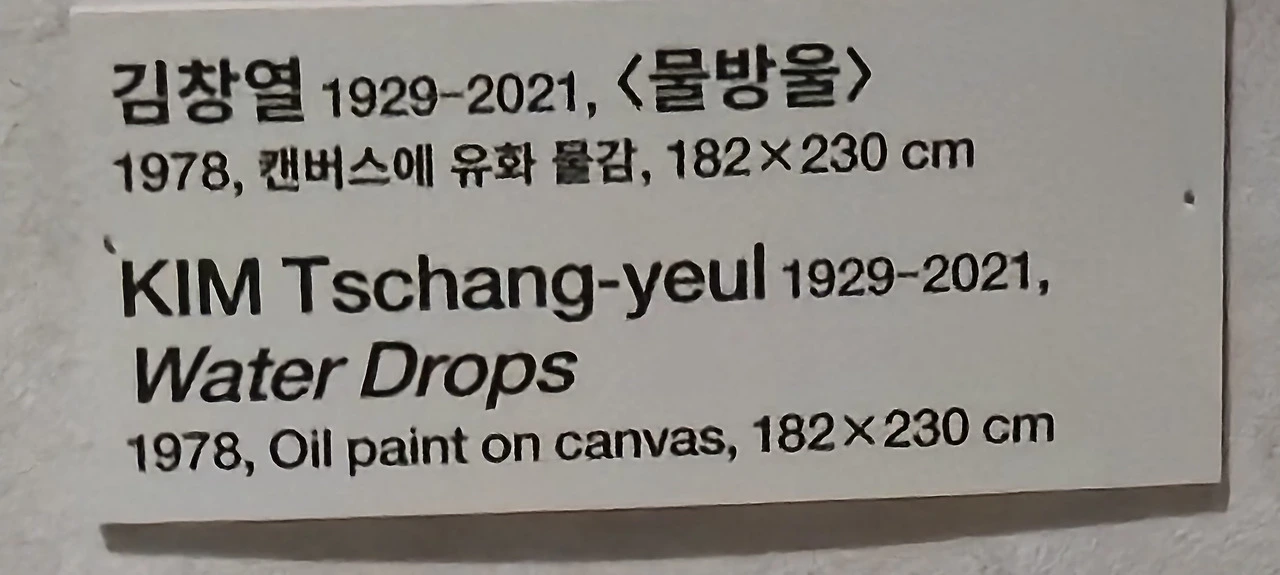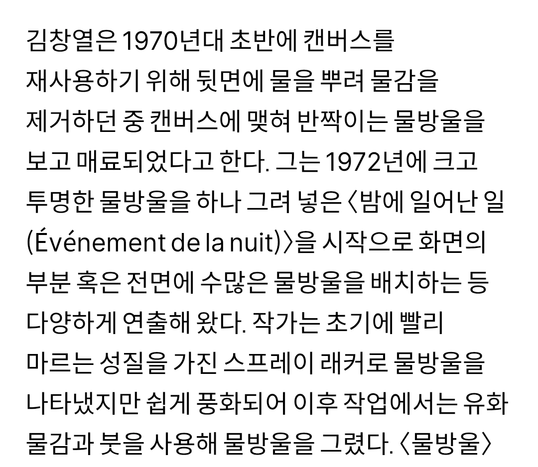 김창열 화백님이 배고프던 시절 재사용하려는 캔버스에 맺힌 물방울의 미학을 발견하신 선생님의 예술적 안목이 물방울이라는 독자적 테마를 탄생시켰습니다 ^^.
