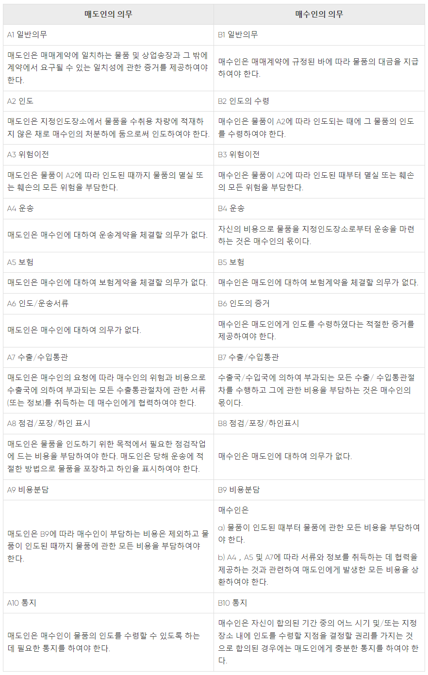 인도가 중요한 이유는 A3와 B3에서 볼 수 있듯이 인도의 시점 전에 발생한 물품의 멸실 또는 훼손의 모든 위험은 매도인이 부담하지만 인도된 때부터는 매수인이 부담해야 하기 때문입니다. 또한 A9와 B9에서처럼 인도된 때를 전후로 비용의 분담 주체가 바뀝니다.