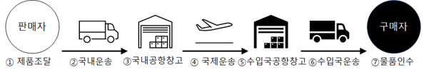 1. 제품조달(판매자) -> 2. 수출국 국내운송 -> 3. 수출국 공항 창고 -> 4. 국제운송(항공기) -> 5. 수입국 공항 창고 -> 6. 수입국 국내운송 -> 7. 화물인수(구매자)