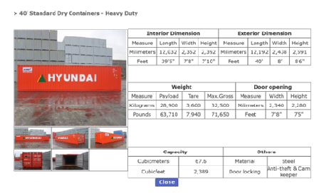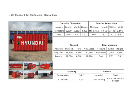 위 그림은 우리나라의 대표적인 외항선사인 현대상선의 홈페이지(www.hmm21.com)에서 발췌한 20피트 컨테이너 제원표입니다.