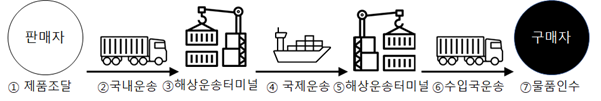 1. 제품조달(판매자) -> 2. 수출국 국내운송 -> 3. 수출국 해상운송 터미널 -> 4. 국제운송 -> 5. 수입국 해상운송 터미널 -> 6. 수입국 국내운송 -> 7. 물품인수(구매자)