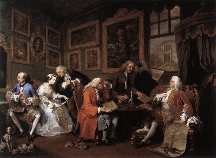 호가스의 대표적 작품 중 하나인 <유행에 따른 결혼 풍속 Marriage à la Mode"1743-1745>연작이다. 당시 상공업으로 성공은 하였으나, 지식과 도덕적으로는 교육이 부족했던 일부 부르주아들의 결혼 과정과 그 파멸에 대한 이야기로 유머스러운 해학과 더불어 날카로운 시선으로 사회를 꼬집듯 표현하고 있다.