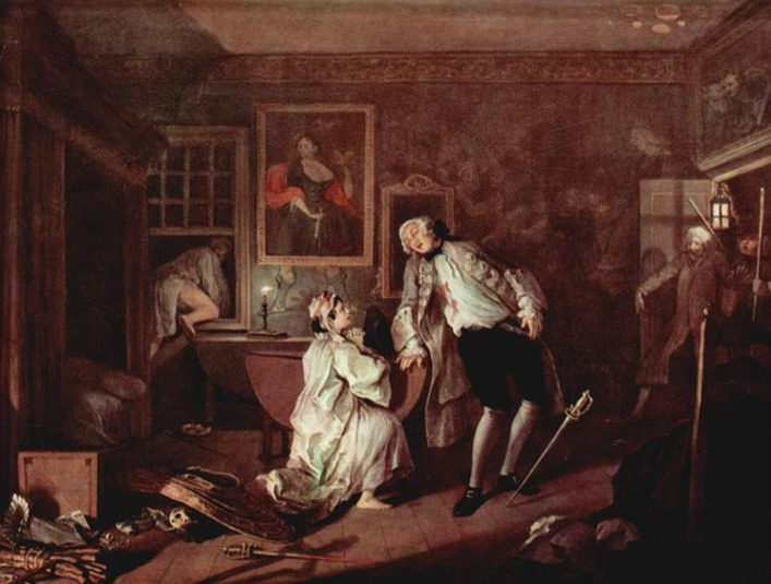 영국의 대표적 풍자화가인 '윌리엄 호가스'(William Hogarth 1697-1764)의 작품은 연작 시리즈로 구성되어 있는 것이 많다. 호가스 작품의 특징은 세속적인 세상에 대한 풍자를 담고 있다는 것이다. 17C-18C 영국의 지배력을 행사한 계급은 일종의 상업 귀족들이었다. 이후 본격적으로 재산 소유에 기초를 둔 근대적인 사회관계가 성립하게 되었다. 영국의 18C 중엽 의회는 정당정치와 의회제도가 점차 정비되어 갔지만 그 이면에는 부패와 타락이라는 부도덕이 숨어 있었다. 이러한 상황 속에서 상공업은 발전하였고 그 발전으로 인해 서민층의 생활은 향상되었으며 또한 의회정치의 발전으로 정치에 대한 국민들의 관심은 커져 갔다. 커피숍은 당시 정치를 의논하고 문학자와 예술가들이 담론 하는 장소의 역할을 하기도 하였다. 이에따라 철학과 문학예술은 점차 발달하게 되었으나, 자본의 탄생으로 인해 빈부의 격차와 일부 부르주아들의 타락은 심하디 심해 곯아 터질 정도로 매우 부패해져 있었다. 호가스는 이들 일부 부르주아들의 타락을 매우 신랄하게 화폭에 표현함으로써 이는 마치 한 편의 소설을 읽듯 탄탄한 구조와 짜임새가 매우 정교하게 표현하였다.
