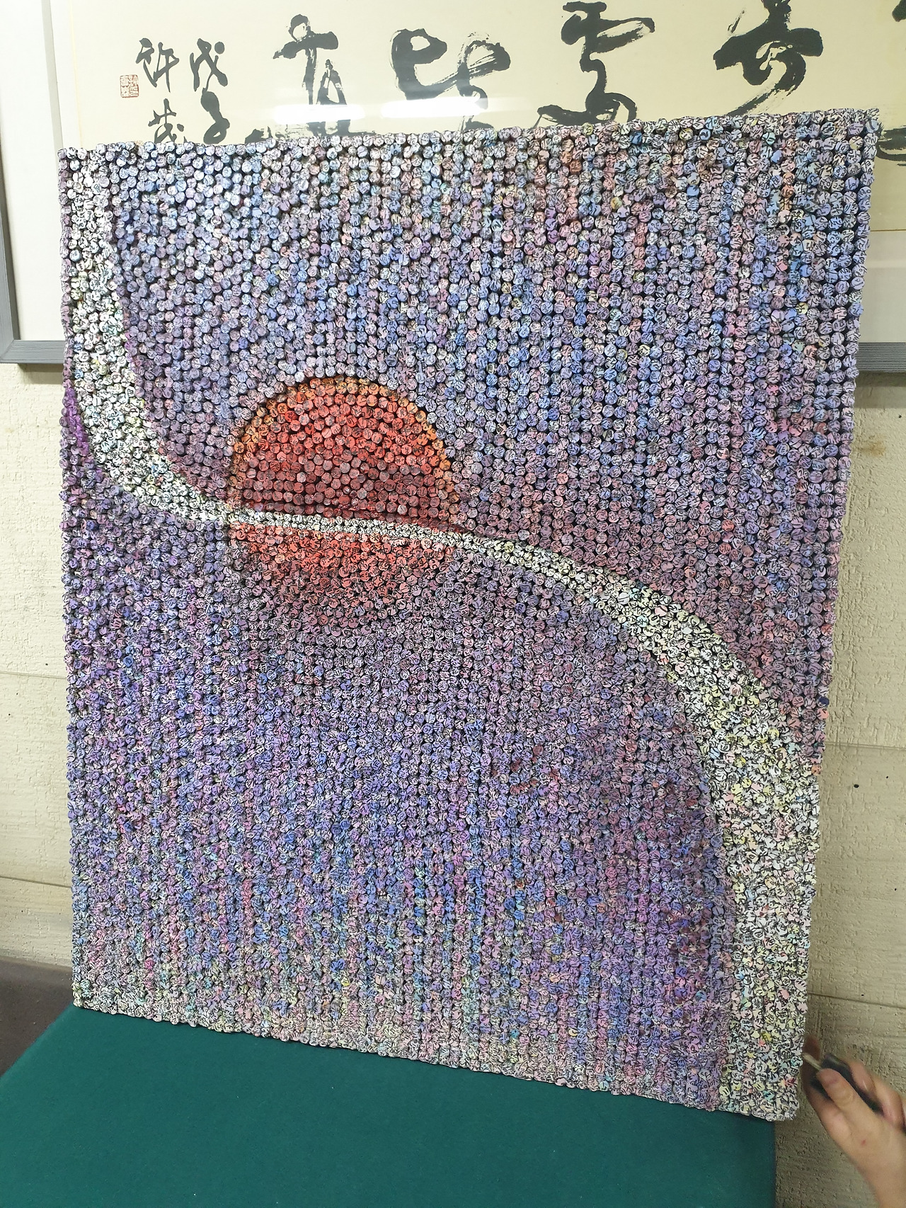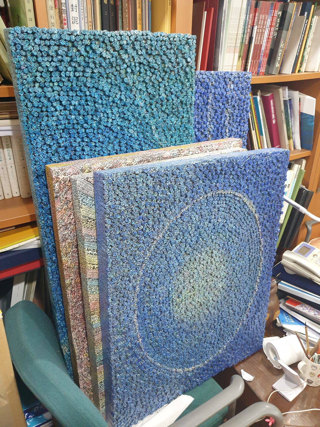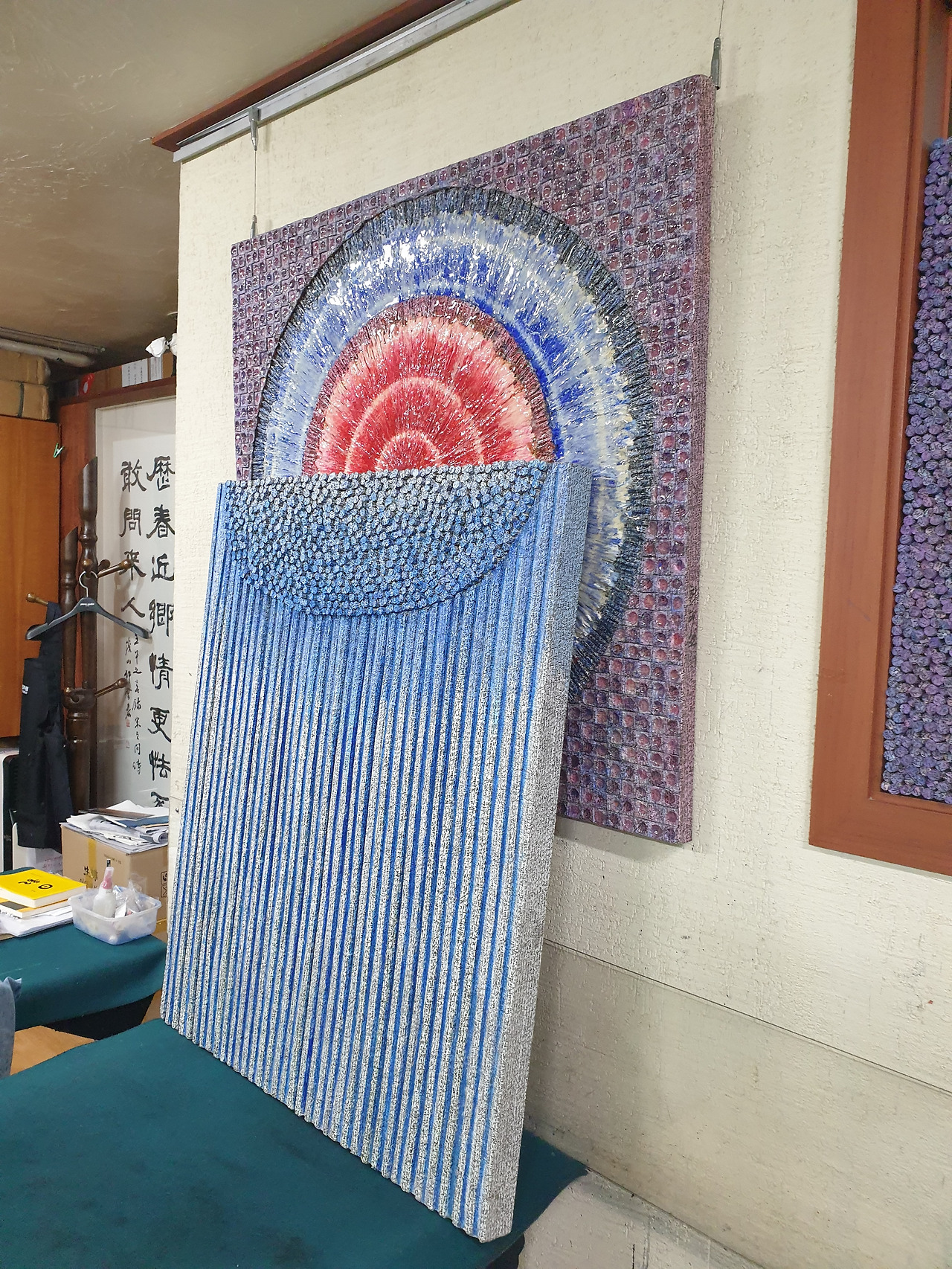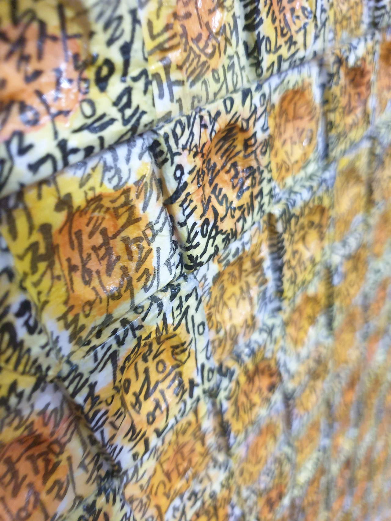 채색한 한지에 직접 손으로 작품에 맞는 글을 쓴 후 그것을 다시 말아 높낮이가 다르게 풀로 붙인다.그리고 그 위에 특수물질을 발라 제작한 작품들이다.