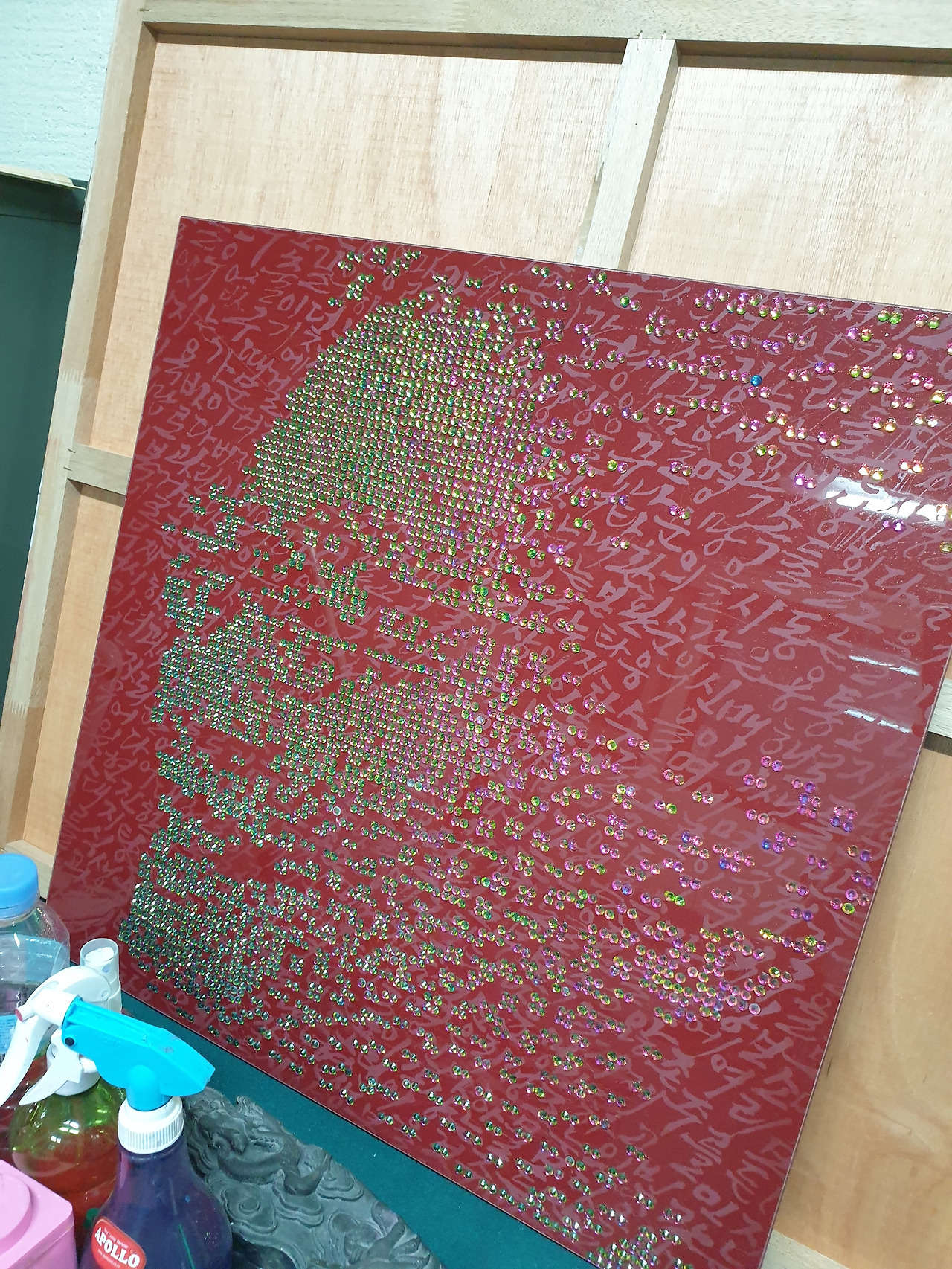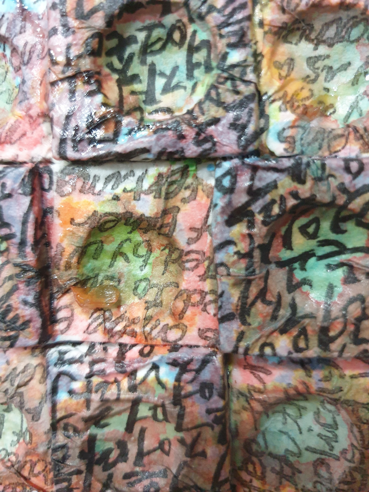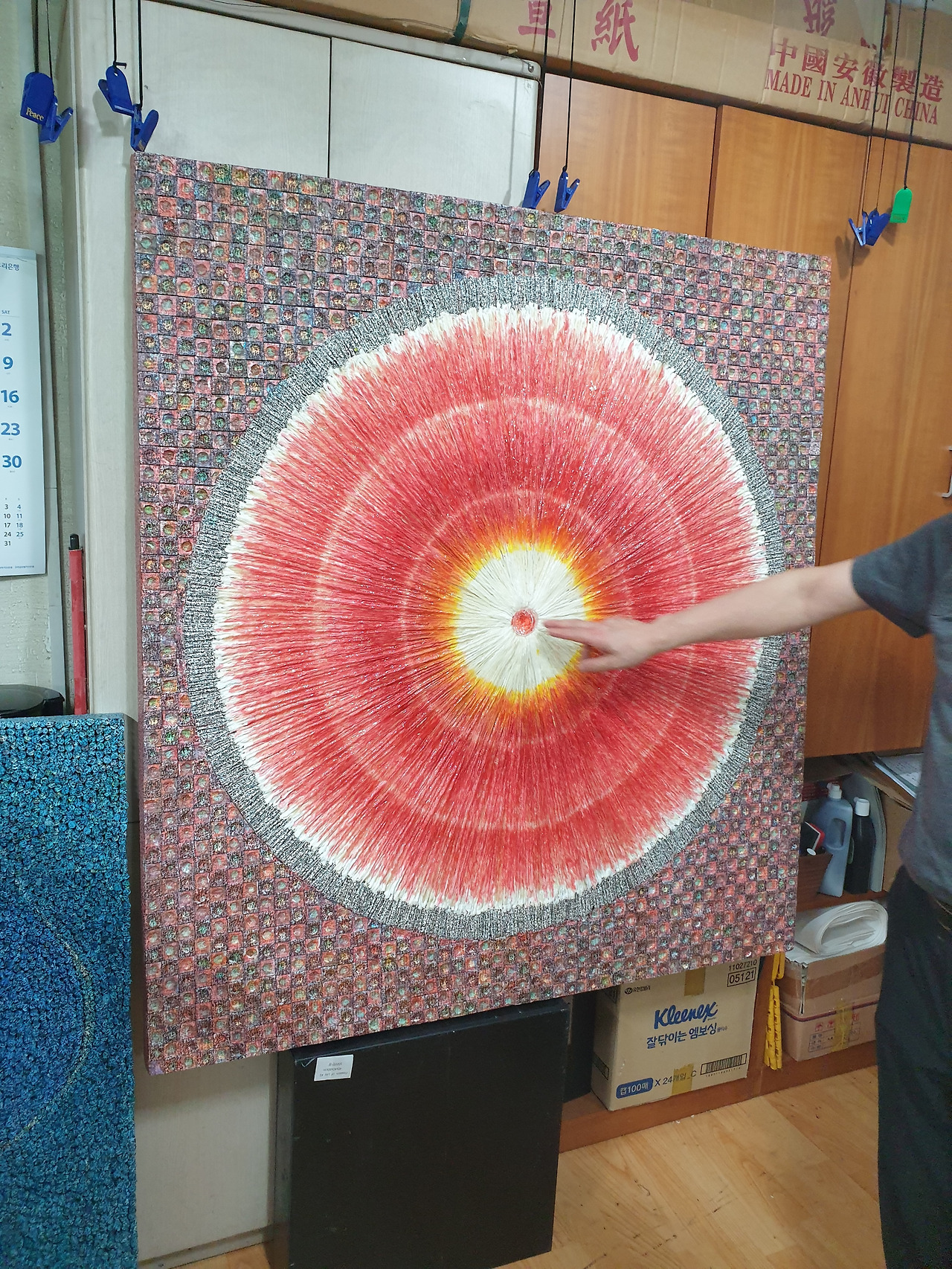 채색한 한지에 직접 손으로 작품에 맞는 글을 쓴 후 그것을 다시 말아 높낮이가 다르게 풀로 붙인다.그리고 그 위에 특수물질을 발라 제작한 작품들이다.
