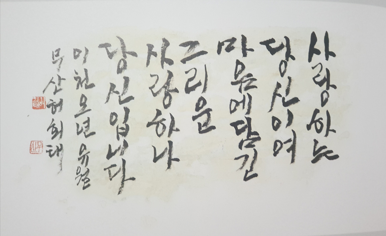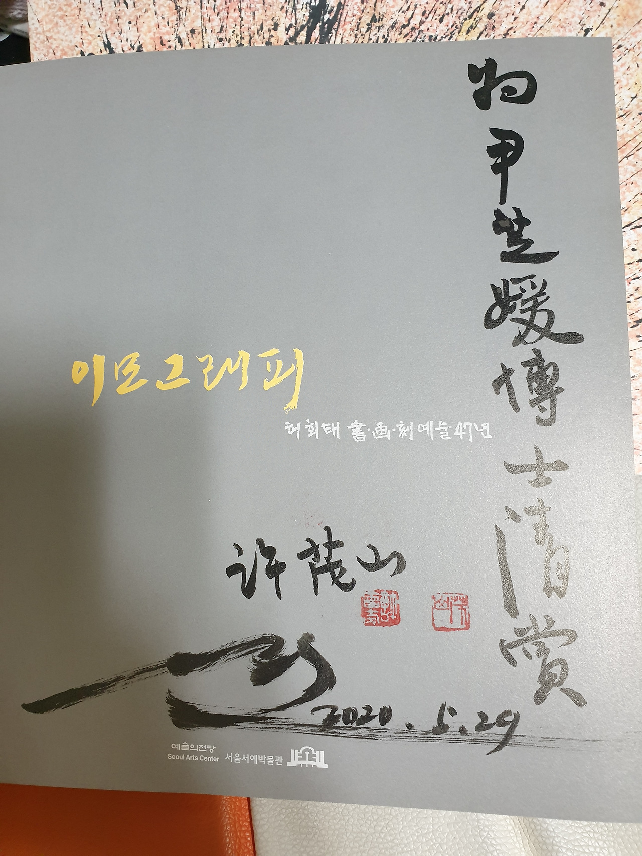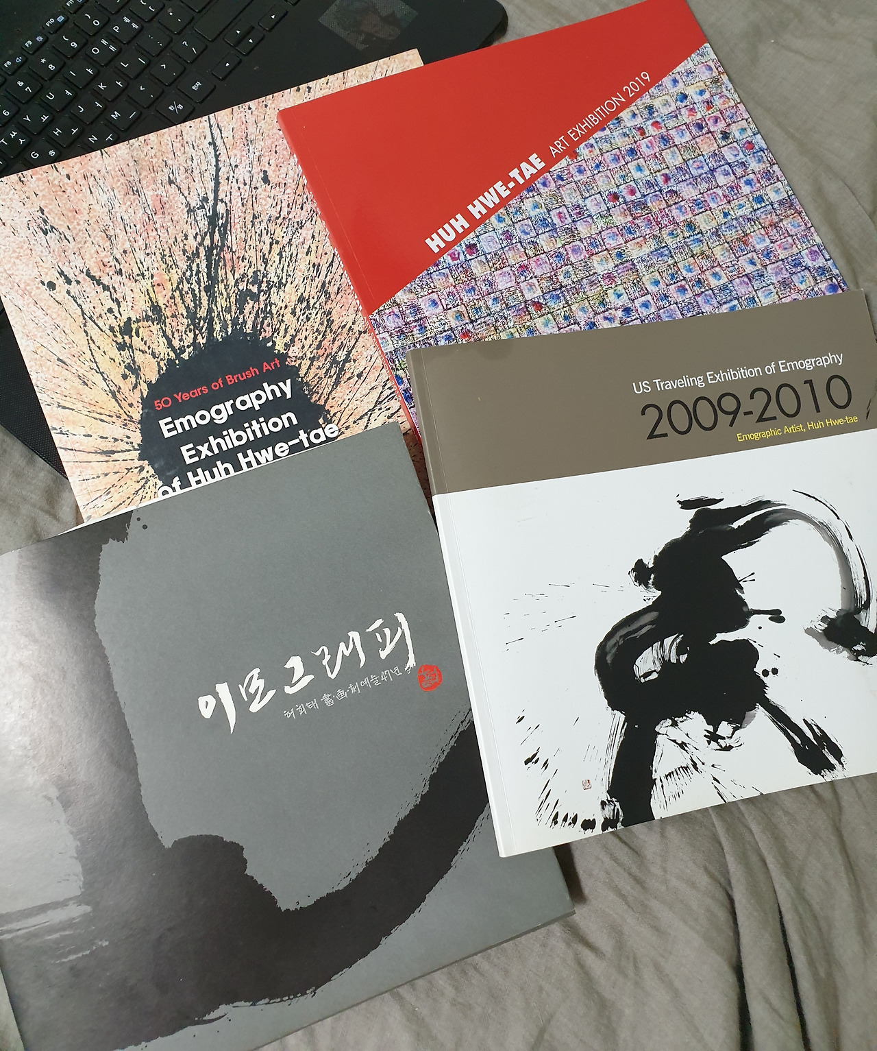 이모그래피의 창시자이며 한국을 대표하는 최고의 작가인 무산 허회태 선생님의 작업실에 초대를 받아 다녀왔다. 이모그래피(Emography)란, 글자가 가지고 있는 철학적 의미를 담아 그 글자를 회화화 시킨 현대미술과 서예의 새로운 분야이다. 이모그래피는 칼리그래피에서 그 어원을 찾을 수 있다. 칼리(칼로스 Kalos 그리스어)란 아름답다라는 뜻의 의미로 글자를 아름답게 표현한 것이다. 칼리그래피는 단순히 시각적 아름다움을 추구하는 글자이나 무산의 이모그래피는 이모션(Emotion) 즉 감정을 담은 글자라는 뜻으로 미적 감정(aesthetic emotion)을 위해 쓰여진 미서(美書)라는 뜻이다. 무산의 작품세계는 서예에 국한된 것이 아닌 우주적 에너지와 생명을 불어넣는 융합예술로 화선지 위에 영혼을 울리는 한 획을 긋는 붓질로써 세상이 변화하는 형상을 담아낸 것이라 할 수 있다. 무산 선생님의 글은 시원하여 맑고 굵직한 그리고 간결한 구도와 선을 가지고 있는 것이 특징으로 현재 현대미술을 대표하는 데미안 허스트와 제프쿤스의 미술평론과 전시 서평을 써왔던 세계적인 미술 평론가인 Tatana는 독일에서 직접 작가의 작업실에 찾아와 작품세계를 논하고 그의 평론을 쓰기도 하였다. 또한 한국에서 가진 개인전 뿐만 아니라 전 세계의 유명 뉴스의 보도와 함께 미국 등에서는 7개월이 넘는 기간 동안 순회전시를 하였으며 유럽 등지에서 많은 전시회를 가진 우리나라 최고의 작가이며 서예가이다.