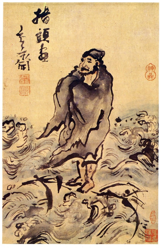 18C경 조선에서는 도석화(道釋畫)가 매우 유행하였다. 그러나 이 시기 도석화는 종교화 본래의 용도보다는 일상적인 용도 즉 감상용으로 그려지거나 병풍으로 제작되어 집 안의 장식이나 행사 시에 사용하기 위해 그려진 그림들이 많았다. 심사정이 남긴 도석화는 현재 15점 정도 되는데, 이는 아마도 주문에 의해 제작된 것으로 전문가들은 보고 있다. 위의 그림은 심사정의 지두화(指頭畵)이다. 심사정은 풍경화뿐 아니라 인물화도 지두화법으로 그렸는데 오히려 인물화에 지두화법을 더 즐겨 사용했다. 이 그림은 손톱으로 매우 빠르게 그리고 먹을 살짝 찍은 눈은 그윽하다. 그리고 달마가 먼 곳을 응시하는 얼굴은 붓으로 그린 것보다 달마의 내면을 더 심도 있게 표현하고 있다. 또한 날카롭고 각진 달마의 가사는 바람에 펄럭이는 소리가 들리는 듯하며, 물결은 여기저기 먹이 뭉쳐있다. 이러한 선들은 그림에 강한 생명력을 불어넣어준다.
