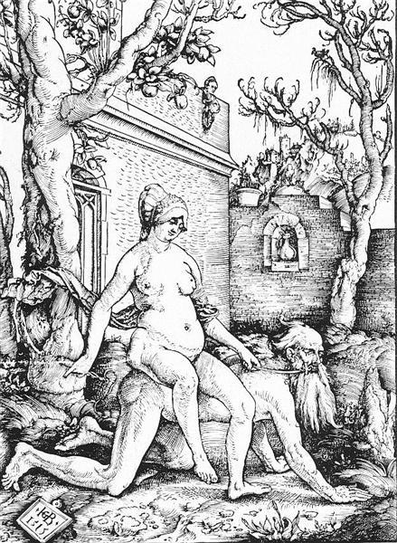 투구를 쓴 나체의 여인이 늙은 남자의 등에 올라타 있다. 이랴이랴 채찍을 휘두르며 말이 자신이 원하는 곳이라면 어디든 향해 갈 수 있다는 듯 여유로운 모습으로 말이다. 여인은 노인을 한껏 조롱하는 표정으로 왼손에는 노인의 긴 수염을 잡아끌고 있는 모습이다. 노인 또한 벌거벗은 모습으로 당신이 내 곁에만 있어 준다면 나는 모든 것을 버리고 당신의 영원한 말이 되겠소라고 말을 하는 듯 보인다. 그림의 왼쪽에는 남자가 내려 놓은 책이 보인다. 이것은 욕망을 얻기 위한 남자의 심리를 그대로 보여 주고 있다. 앙상한 남자의 엉덩이와 쳐진 근육은 마치 살아있는 신체가 아닌 곧 생명력을 잃을 것 같은 모습이다. 여인의 풍성한 배와 엉덩이는 앙상한 노인에게 눌려 살이 뭉그러지고 있다. 그러나 노인은 그 무게를 무릎과 흔들리는 팔로 견뎌내고 있다. 도대체 저 남자는 왜 여인을 등에 올리고 말이 되었을까?