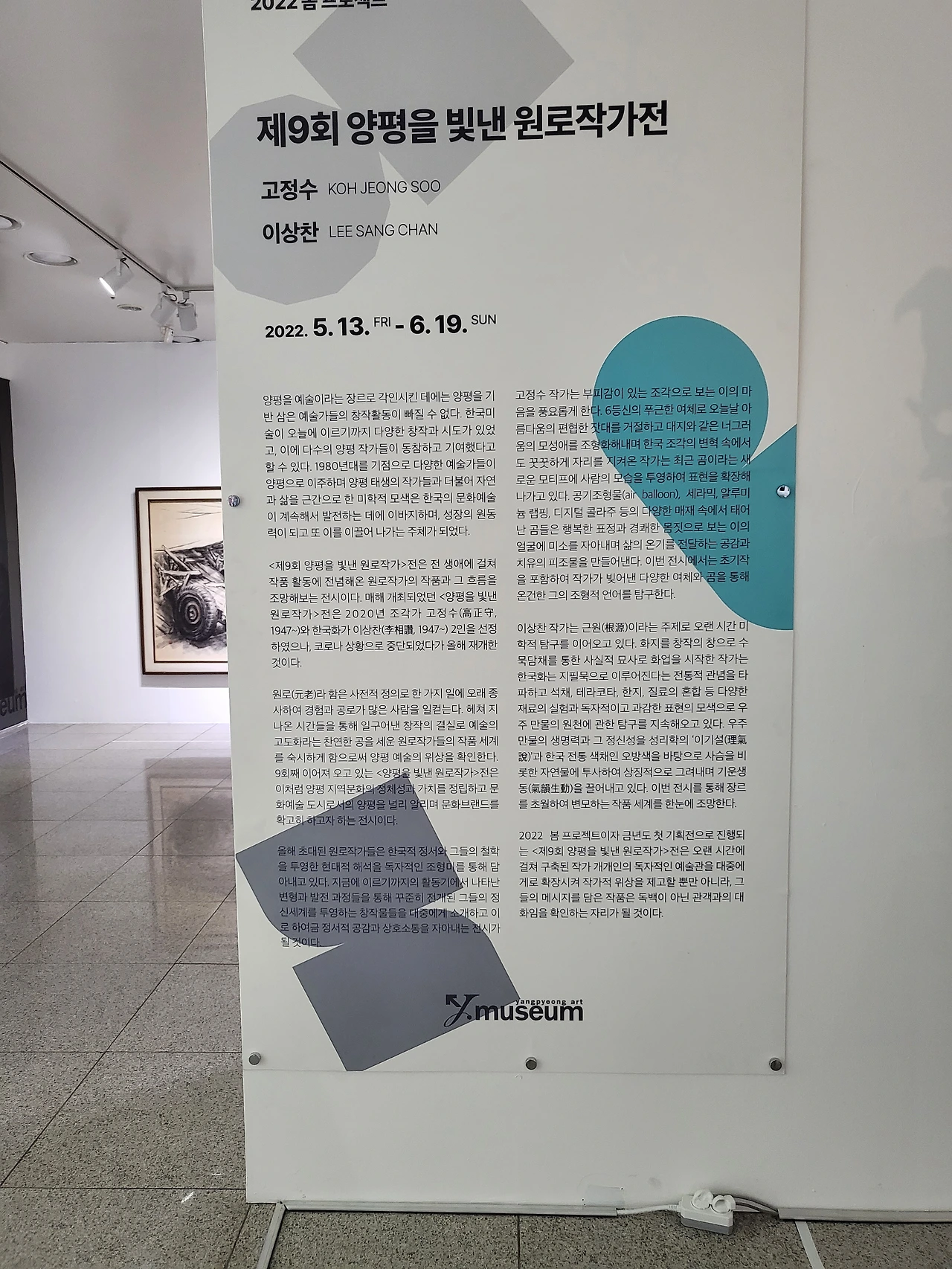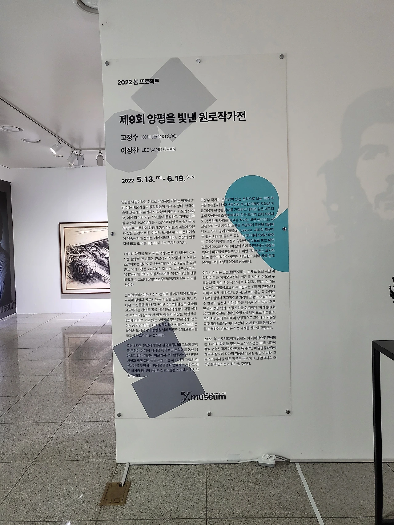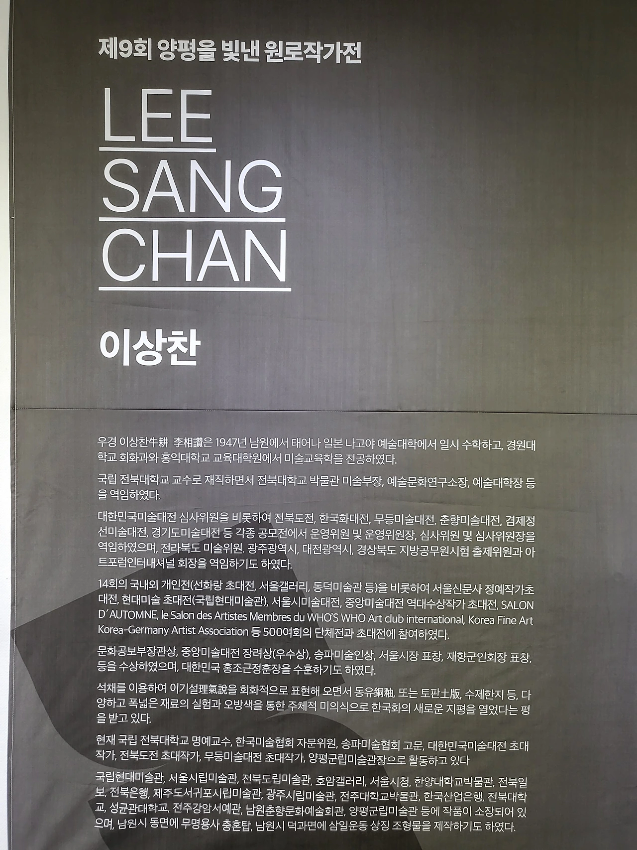 봄바람이 아름다운 날 아카시아 꽃이 아름드리 핀 양평은 언제 찾아도 편안하다. 내가 본 양평군립미술관은 관으로써의 미술관 중 단연 최고라고 칭하고 싶다. 언제나 좋은 작품 열정 가득한 화가 그리고 널찍하고 여유로운 전시공간은 차분함과 힘이 공존하는 장소이다. 무엇보다도 현재 미술관의 관장이시자 전북대학교 명예교수이신 이상찬 선생님을 뵙고 예술의 사회적 기능과 가치 그리고 창의적 활동을 하는 화가라는 직업을 갖고 있는 이들이 갖추어야 할 자세에 대해 대화를 나눈 귀한 시간이었다.