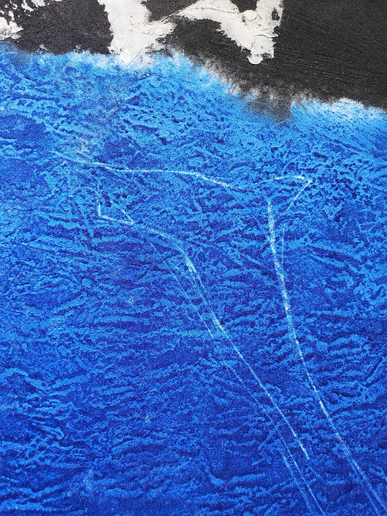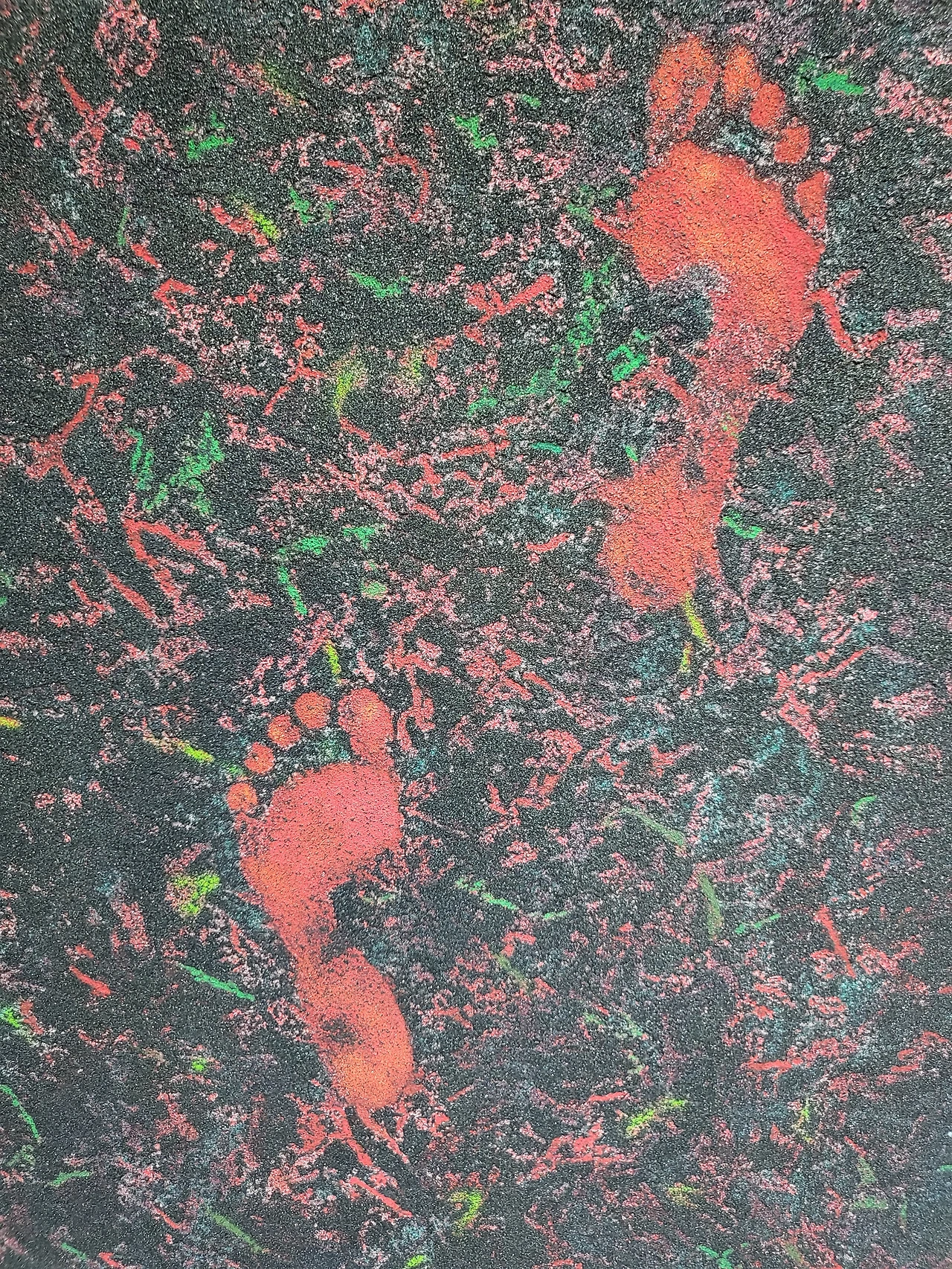 나의 작품의 뿌리는 지극히 한국적인 것 즉 전통적 한국화에 근원을 두고 있습니다. 내가 석채(광물의 가루ㅡ천연보석포함)를 이용해 만든 작품은 뿌리고 그 위에 또 뿌리는 작업을 반복합니다. 태초의 지구가 켜켜이 쌓아져 과거 현재 미래가 만나 하나의 결정체를 완성하듯 근원과 흔적 그리고 우주만물의 연원에 대한 질문과 성찰에 대한 결과물입니다.