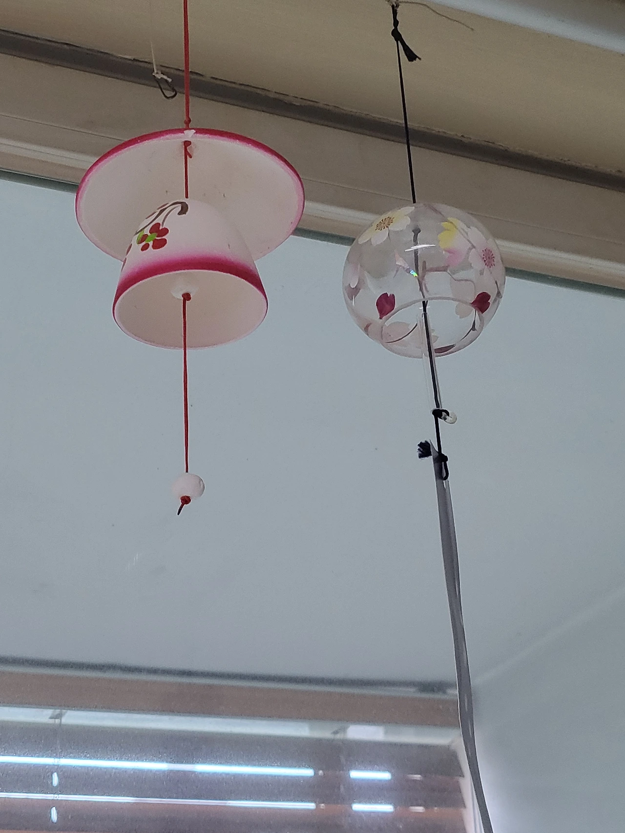 나는 무용한 것들을 사랑한다. 하늘, 별, 해와 달 그리고 꽃, 바람 그런 것들을. 드라마 미스터 선샤인에 등장인물 변요한의 대사처럼 말이다. 이 맘 때쯤 거실 베란다를 열어 놓으면 수제유리풍경이 바람이 왔다는 소리를 낸다. 팅~딩~띵~ 그 소리를 들으며 가만히 누워 있으면 시끄럽던 맘과 머리가 맑아진다. 몇 해 전 합정 교보문고에서 책을 보던 중 작은 상자가 눈에 들어왔다. 앗! 풍경이다. 생각보다 큰 지출을 해 버렸다. 나를 위해 이 정도는 선물해야지 하는 맘으로 예쁜 색으로 고르고 골라 선택한 지금의 저 예쁜 풍경. 베트남 여행 시 선물 받은 풍경과 나란히 걸려 있다. 그러나 베트남 풍경은 한 번도 소리를 내지 않는다. 왜일까?