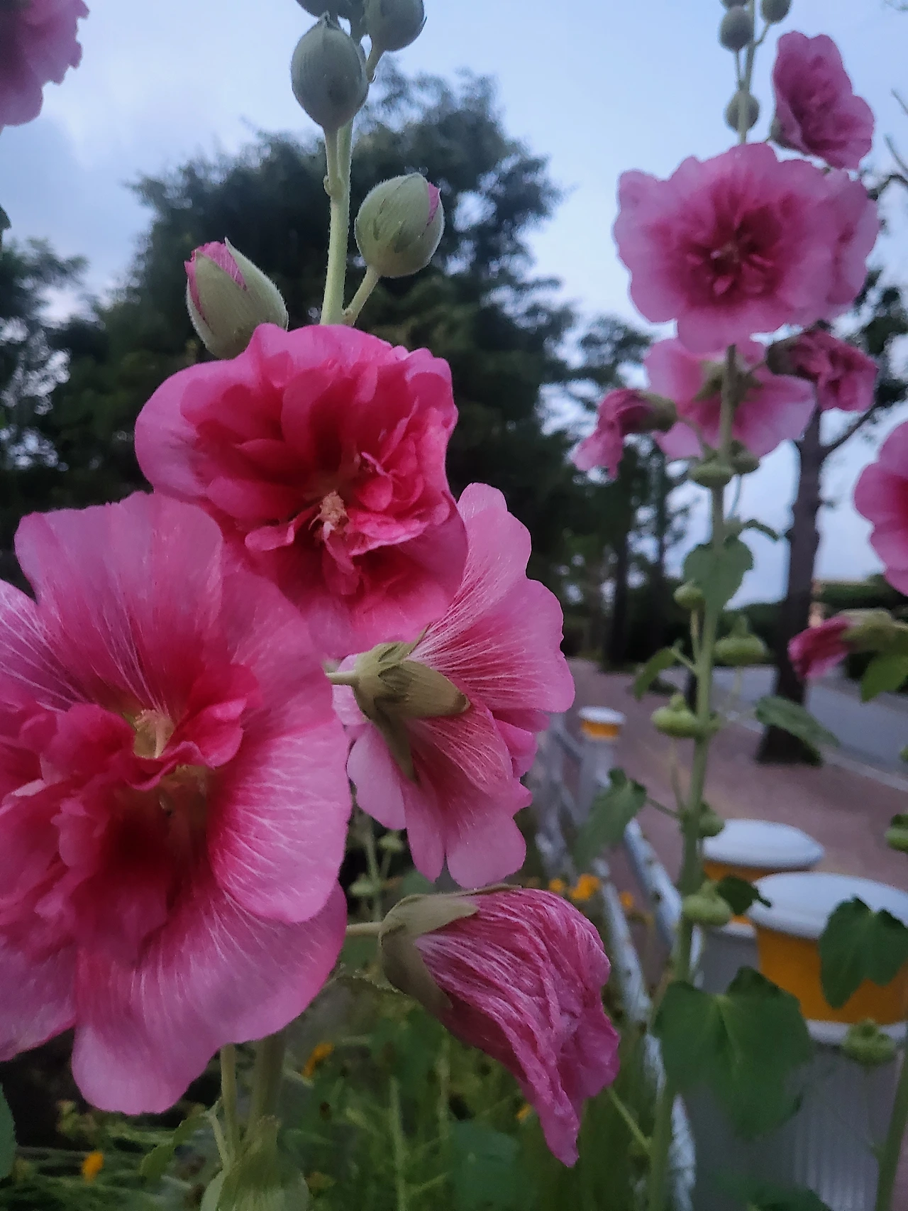 어제 운돔하고 돌아오는 길에 핀 접시꽃. 같은 접시꽃도 색이 다 다르다.