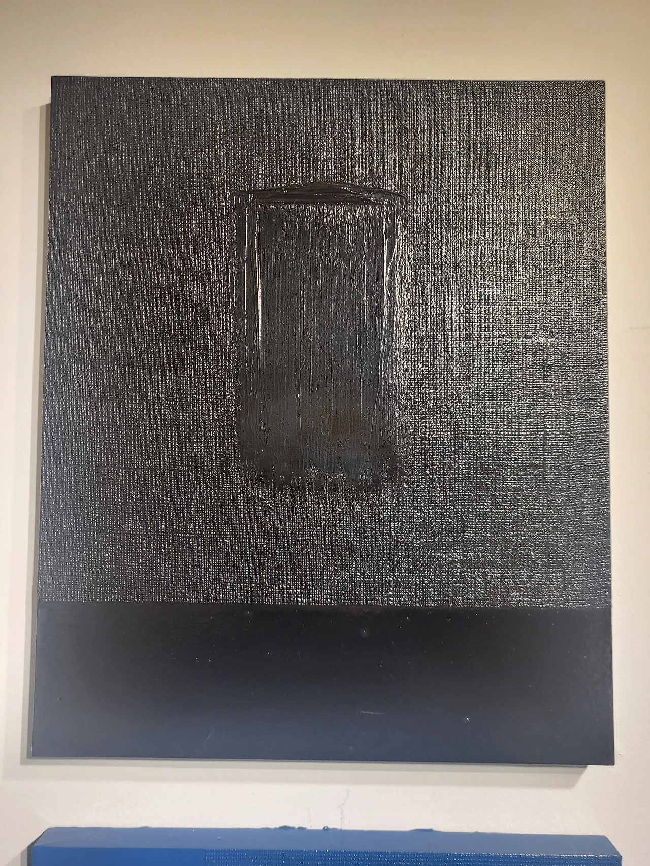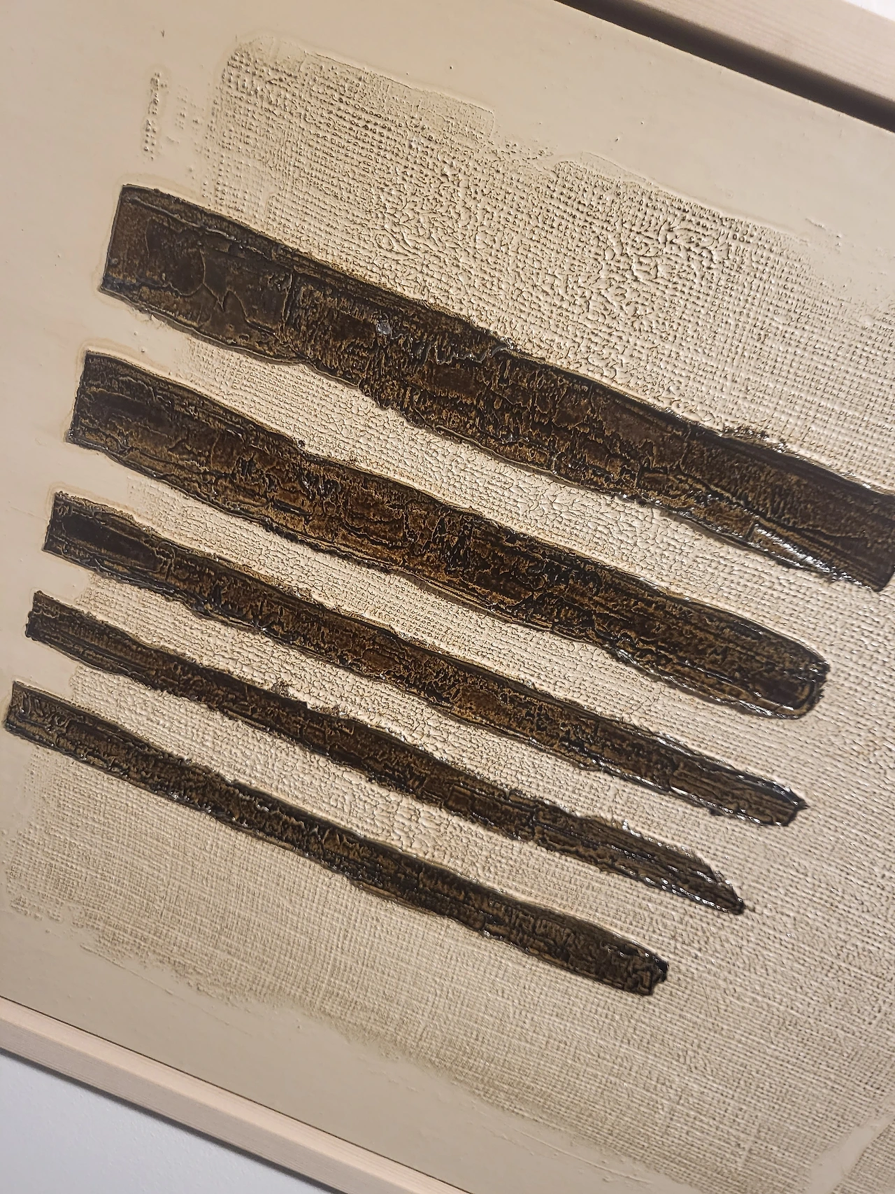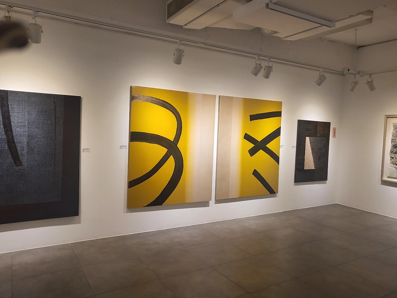 작품의 구성요소는 아주 간결하다. 배경과 대비되는 굵은 한 줄기의 선 또는 정형적인 기호? 와 같은 것들이다. 어찌 보면 블랙 페인팅(Black Painting) 이라 불리었던 프랭크 스텔라가 시도했던 계산된 선의 모양과도 흡사하다. 그러나 스텔라의 작품과 달리 이형곤이 사용하는 굵고 짧은 선은 마침표와 같다는 생각이다.