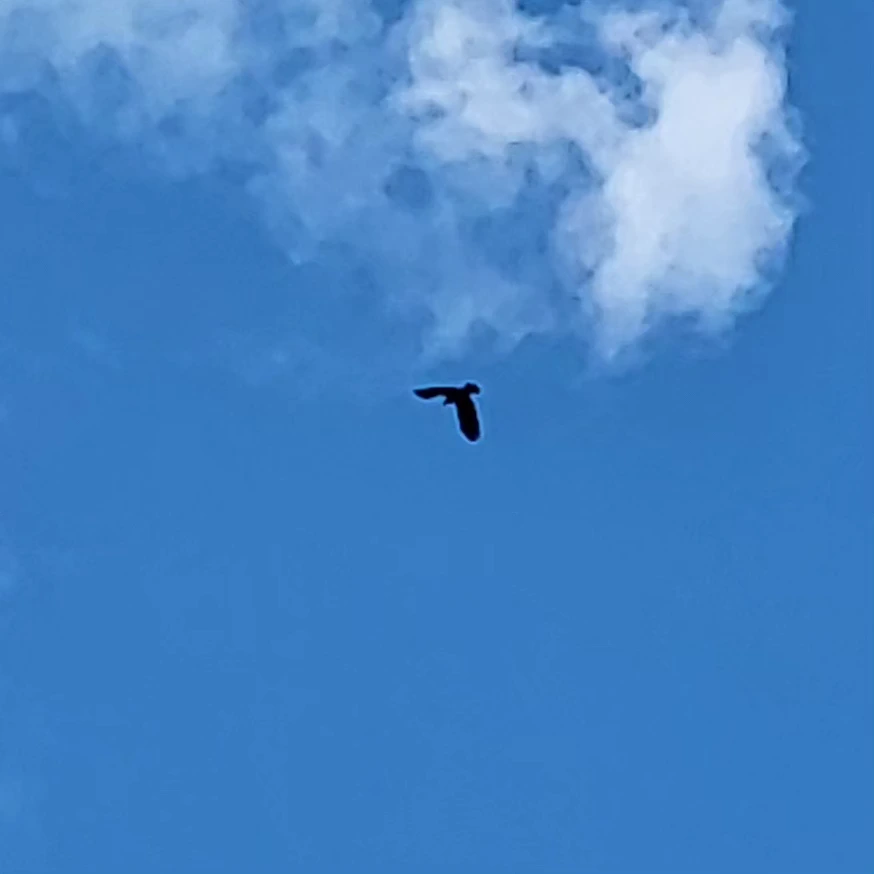 까마귀가 푸른 하늘을 날고 있다. 아름답다.