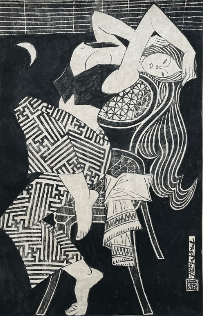 On the Front Porch, Phùng Phẩm, 67x43cm, Woodblock print, 탕롱갤러리 하노이.