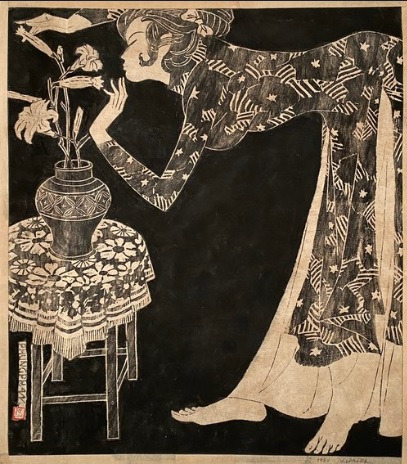 Young Girl and Flowers, Phùng Phẩm, 61x52.5cm, Woodblock Print, 탕롱갤러리 하노이.