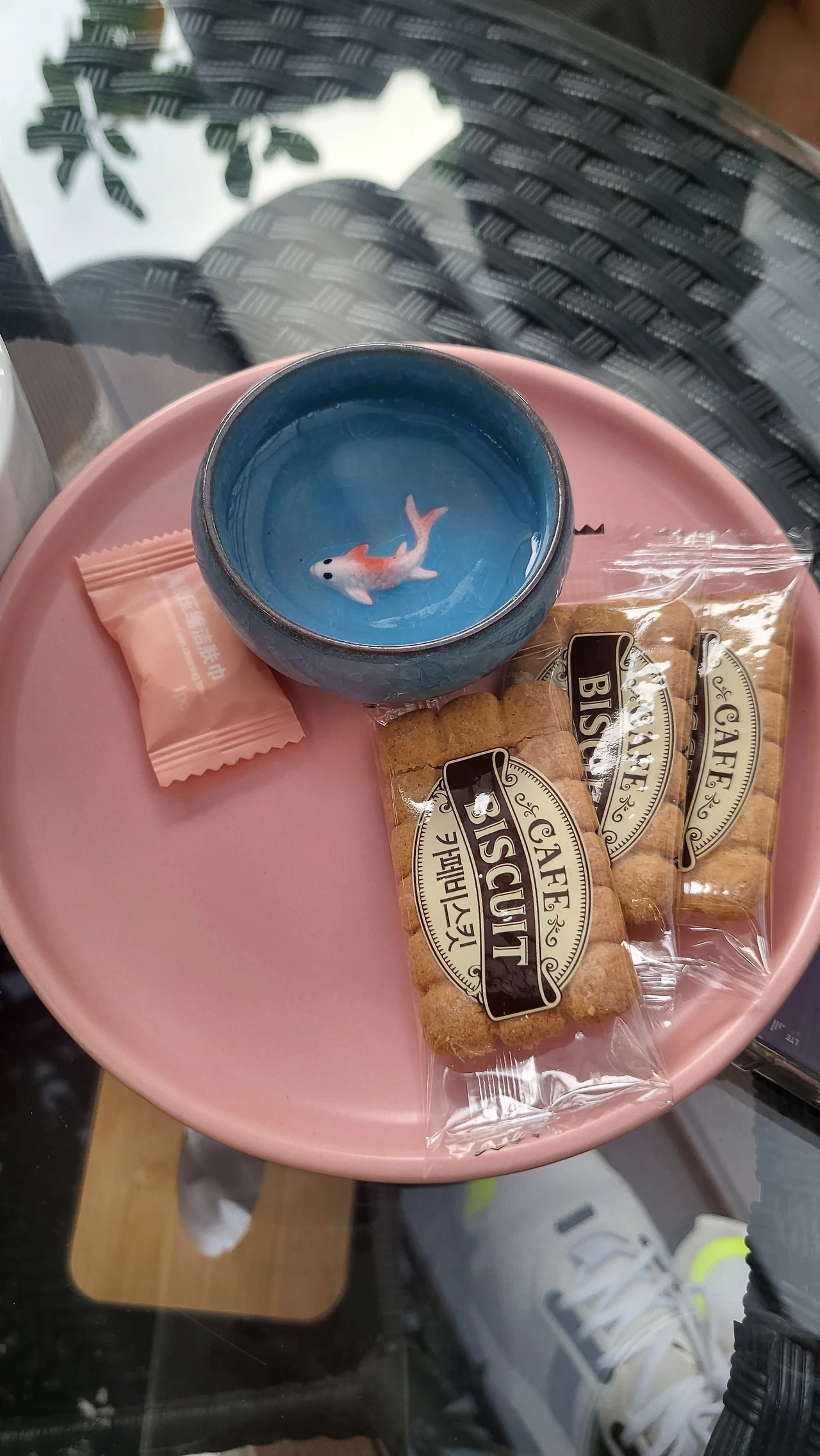집앞카페에서 바라본 풍경 그리고 분홍색 봉지에 들은 물티슈. 함께 한 친구가 이 카페에 처음왔을 때 사탕인줄 알고 꽉 깨물자 직원들이 웃었다는 얘기에 배를 잡고 웃었었다.