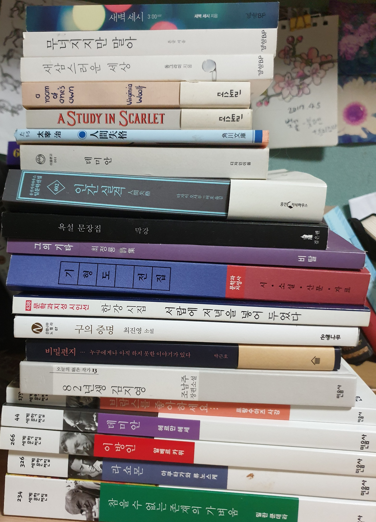 딸이 좋아하던 책들을 모아 보았다. 이것은 아주 일부이다. 우리집은 책더미 속에 깔려살 정도로 책이 널려져 있다.