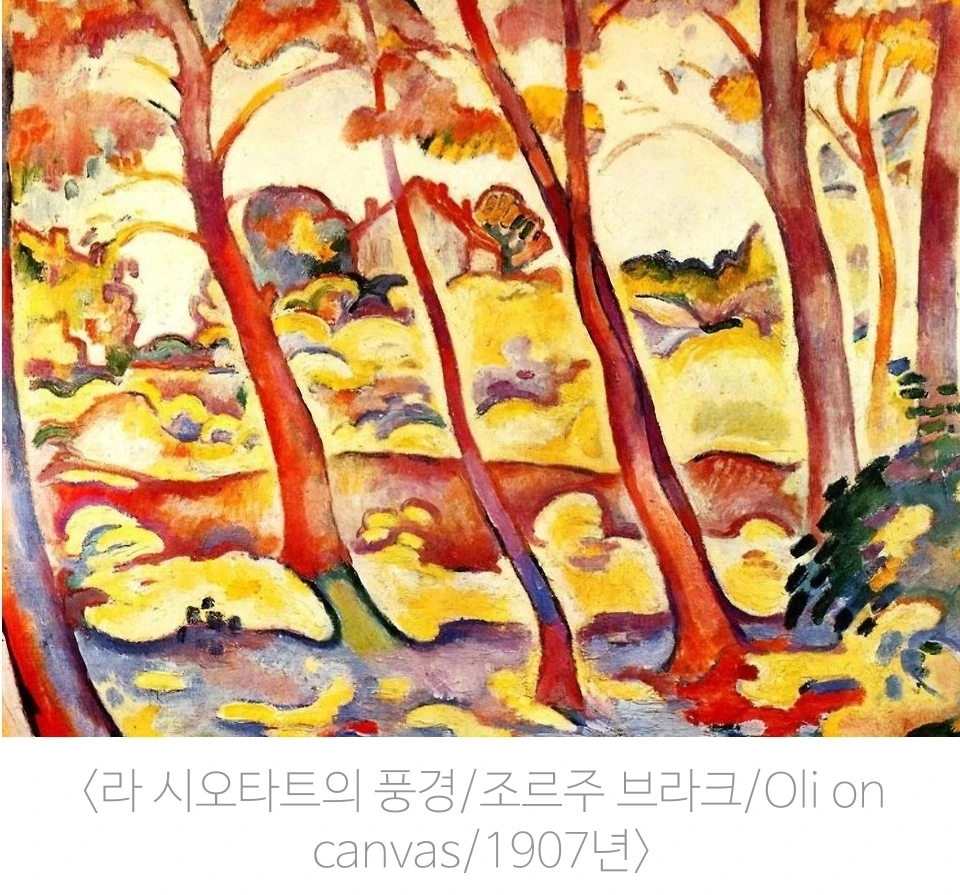프랑스 출신의 화가 브라크는 초기에는 야수파 화풍을 따르며, 거친 붓놀림과 강렬한 색채로 풍경화와 인물화를 그렸다. 그러나 이후 폴 세잔의 영향을 받으며 점차 인상주의에 가까워졌다. 그의 1907년 작품 <라 시오타의 풍경>은 이를 잘 보여 준다. 선명한 색조와 원시적인 색감, 단순화된 형태는 야수파의 특징을 담고 있으며, 곧게 뻗은 나무와 단순한 윤곽으로 표현된 집은 화면 전체에 안정감을 부여한다. 비록 거친 붓질과 원색을 사용했지만, 그 속에는 따뜻함과 시원함이 공존하며 강렬한 인상을 준다.