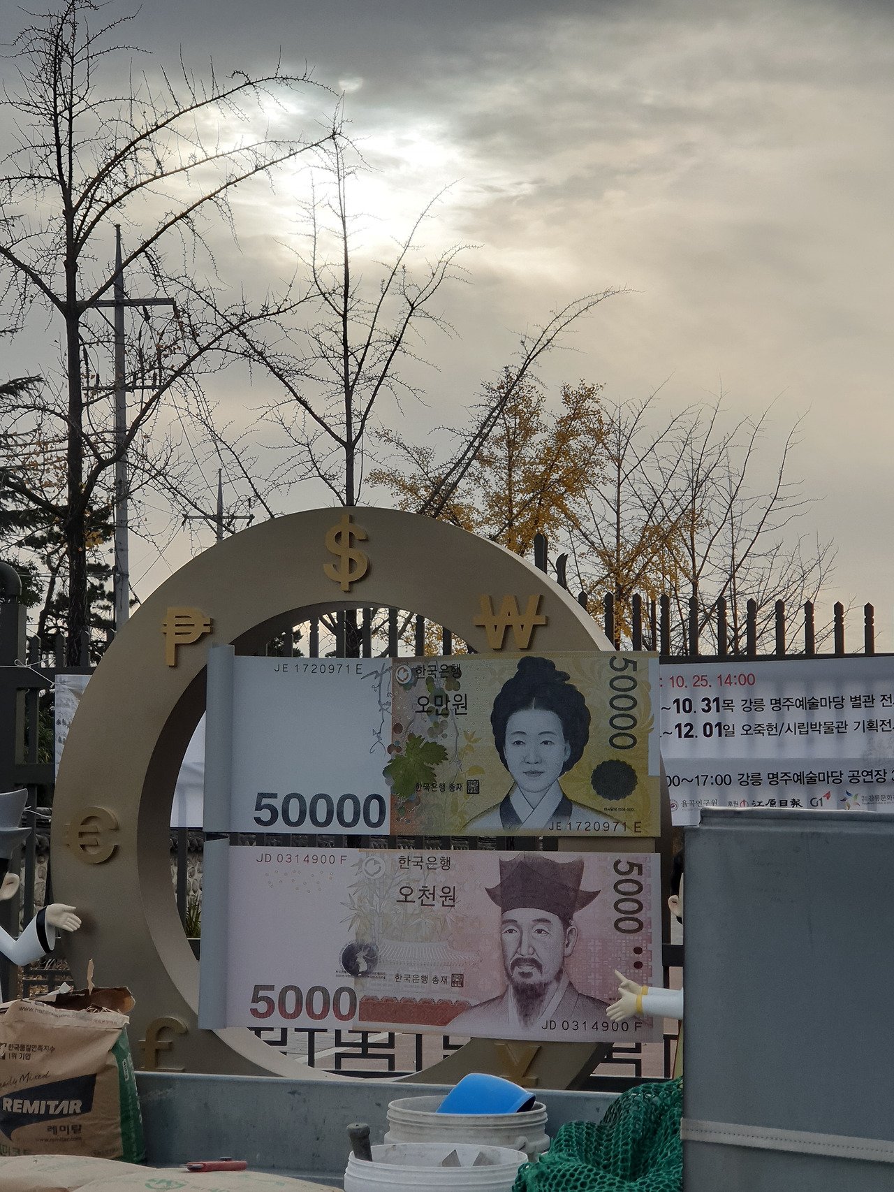 공공미술이란 대중 그 자체를 위한 것이다. 즉 그 대상을 함축적으로 표현하여 대중에게 쉽게 이해시킬 수 있어야 한다는 의미이다. 상징성 그 자체인 것이다. 도시의 상징 또는 관광지의 상징 그리고 지역을 대표하는 상징성. 주로 공공미술은 시나 단체 또는 국가의 세금으로 진행된다. 이러한 공공미술은 지역의 작가나 공고를 통해 선정되는 것으로 매우 중요한 성격을 가지고 있다. 여기 오늘 오죽헌 입구에 설치되고 있던 이것. 돈이라는 상징물이 국가를 대표하는 역사적 상징 건축 입구에 국민의 세금으로 설치될 가치가 있을까? 자본주의 시대를 살아가는 현재! 돈이라는 것이 가지고 있는 역기능을 생각한다면 기암을 토하고 싶다. 등장인물들이 역사적으로 중요 인물임은 이해하나 자본의 상징인 돈을 실사 그 자체로 세워 둔다는 것에 대해 글을 읽는 독자들의 생각을 묻고 싶다. 세계 어디에서도 돈을 상징물로 세워 둔 곳을 나는 아직 보지 못했을 뿐더러 그것이 상징물이 된다면 그 곳이 아무리 중요한 지역이라도 부득이한 경우가 아니라면 찾아갈 생각이 없다.