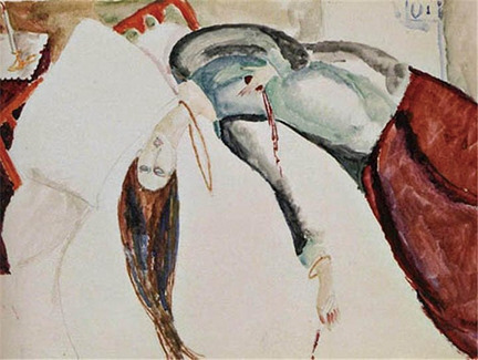 그림 속 여인은 풍성한 머릿결과 매끄러운 선홍색의 피부 그리고 입술을 꼭 다문 채 매우 안정된 모습으로 시선을 아래로 향하고 있다. 그림을 그리는 이와의 시선의 마주침이 마치 부끄러운 듯 말이다. 그림 속의 여인은 거친 붓질 속에서도 부드러움과 사랑이 가득함을 느낄 수 있다. 이 그림은 표현주의 화가 '아메데오 모딜리아니(1884-1920)'가 자신이 평생 사랑했던 여인인 '잔 아뷔테른(1898-1920)'을 그린 작품이다. 1917년 유명 미술학교인 아카데미 콜라로시에서 디자인을 전공한 잔은 17세의 나이였다. 그러나 화가인 모딜리아니의 나이는 33세. 그러한 둘은 파리의 몽마르트 어느 카페에서 우연히 만나 사랑에 빠지게 된다. 결국 잔의 집안은 모딜리아니를 반대하였으나, 그들은 동거를 시작하였다. 이때 잔의 집안에서는 모딜리아니가 잔을 납치했다고 할 정도로 반대가 심했던 것으로 알려져 있다. 이후 둘 사이에는 딸이 태어났다. 무절제한 생활(알코올 중독)과 가뜩이나 병약 해던 모딜리아니는 자신의 건강을 해치고 가난할 수밖에 없었다. 그럼에도 불구하고 모딜리아니는 자신만의 독자적인 예술세계를 정립해 나아갔다. 잔과 모딜리아니는 서로에게 있어 예술적 동지이자 사랑이며 한 몸이었던 것이다. 그러나 모딜리아니는 얼음장같이 차가운 방에서 결핵성 뇌막염으로 인해 각혈을 하며 누워 있다가 1920년 1월 35세의 짧은 나이로 생을 마감하게 되었다. 그때 그의 옆에는 임신 9개월의 잔이 그를 조용히 지켜보고 있었다. 잔에게 모딜리아니는 뜨거운 생명이었다. 모딜리아니에게 잔 또한 그러했다. 그러한 모딜리아니가 잔의 곁에서 사라지자 모딜리아니가 사망한 다음날 모딜리아니의 장례식 준비가 한창이던 시간 잔은 자신의 집에서 뛰어내려 임신 9개월인 뱃속의 아이와 함께 모딜리아니의 곁으로 영원히 세상을 떠났다. 자신의 두 살짜리 딸을 세상에 남겨둔 채로. 그렇게 둘은 영원한 연인이 되어 우리를 떠난 것이다. 모딜리아니는 원시적 회귀를 원하였다. 그래서 그의 그림에는 강렬함과 어두운 색채 그리고 거친 붓질을 느낄 수 있다. 그러나 세상과 잔을 사랑하는 마음이 담긴 거친 붓질은 우리에게 매우 부드럽게 느껴질 것이다. 그리고 어둡고 강렬한 색채는 늘 병약했던 모딜리아니가 얼마나 죽음을 공포로 느끼고 있었는지도 알 수 있다. 잔과 모딜리아니의 이 뜨거운 사랑을 그 누가 막을 수 있을까? 죽음도 갈라놓지 못한 이 둘의 사랑을 부디 신은 용서 하시고 그들을 더욱 사랑하게 하소서! 이러한 사랑이야 말로 '나는 그 사람이 아프다.'라고 표현할 수 있지 않을까?
