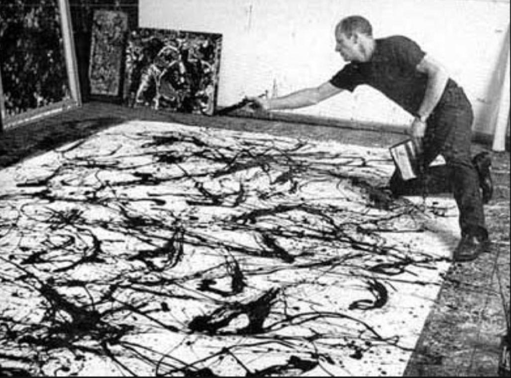 폴록은 기존의 화가들이 그림을 그렸던 방식과는 완전히 다른 방식을 선택하여 그림을 그렸습니다. 보통의 화가들은 이젤에 캔버스를 올리고 작업을 하는 방식 즉 캔버스를 세워서 작업을 하였으나, 그는 캔버스 자체를 바닥에 내려놓았습니다. 즉 이젤 자체를 무시? 한 것입니다. 이것은 단순히 새로운 기법이라는 뜻이 아니라 기존의 유럽 미술과의 결별을 선언하는 액션이었습니다.(이러한 기법 등을 통해 미국적 미술을 유럽에 알리게 됨) 폴록은 바닥에 커다란 캔버스를 깔아 둔 채 공업용 에나멜(당시 산업화, 과학화되어 나온 물건으로 이것은 미국의 산업시대를 반영함을 의미) 그의 액션페인팅은 무의식이 미술의 근원이 되는 자동주의에서 출발합니다.