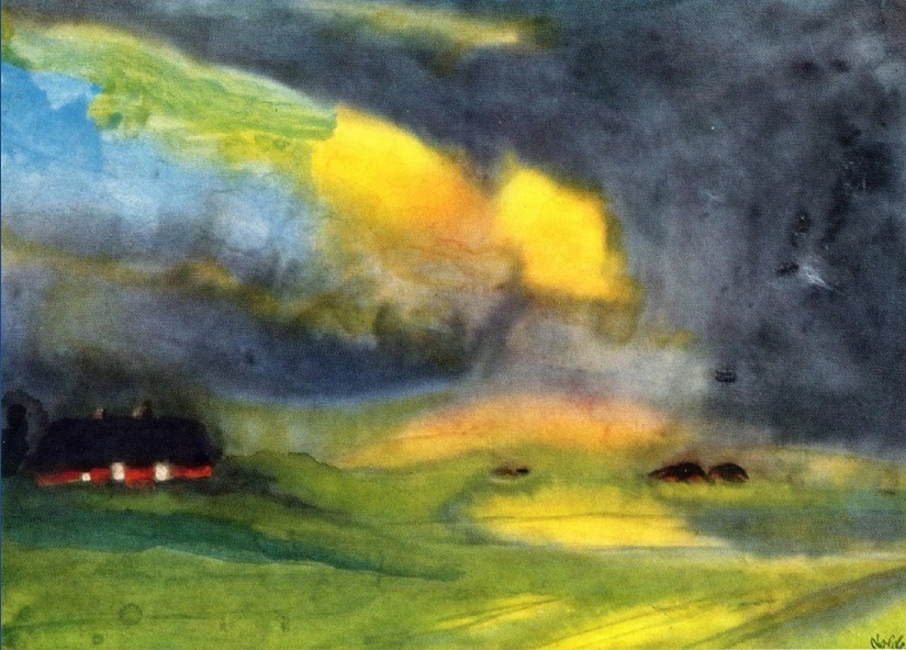 에밀 놀데(Emil Nolde1867-1957)은 독일과 덴마크의 국경 사이 지역에 있는 아주 작은 시골 마을에서 태어났으며, 그의 본명은 "에밀 한센'이다. 그가 놀데라는 이름을 사용한 것은 1902년 자신의 고향 마을의 지명을 따와 이름에 사용하기 시작하여 우리는 지금 그를 에밀 놀데로 알고 있는 것이다. 그가 자신의 고향 마을의 지명을 이름으로 사용한 것만으로도 그가 얼마나 목가적이고 자연적인 그리고 발전이라는 이름하에 자연이 사라져 가는 것을 안타까워했었는지 알 수 있을 것이다. 그는 어린 시절 성장한 마을을 평생 그리워했으며 도시를 끔찍이 저주하도록 싫어했었다. 놀데는 목각사(木刻師)로 일하며 생계를 유지했고 우편엽서들을 그려 팔아 부족한 수입을 보충했다. 이후 본격적인 그림 공부를 위해 뮌헨과 파리로 떠났다.