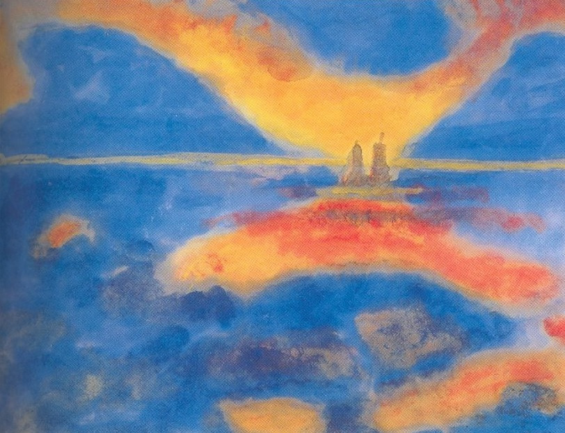 놀데의 그림은 때로는 거친 붓질로 인해 살아 꿈틀대는 그 역동감이 고스란히 전해져 오기도 하지만 그가 그린 수많은 풍경화와 정물화는 대부분 수채물감으로 그려져 있다. 꽃잎의 여리고 얇아 손을 대면 금세 꽃잎에 손자국이 나는 것과 같이 그가 그린 정물화들은 여리고 청순하며 그러면서도 매우 당당한 모습이다. 위의 그림 또한 마찬가지이다. 지는 해에 비친 구름은 붉게 물들어 있으며 붉은 굽이치는 구름은 바다에 비쳐 그 모습은 동시다발적으로 일어난 순간의 포착이지만 선이 없는 그의 그림 즉 색채로만으로 경계를 지어 표현한 그의 그림은 볼 때마다 부드러운 사색?과 따스한 인간애를 느끼게 한다.