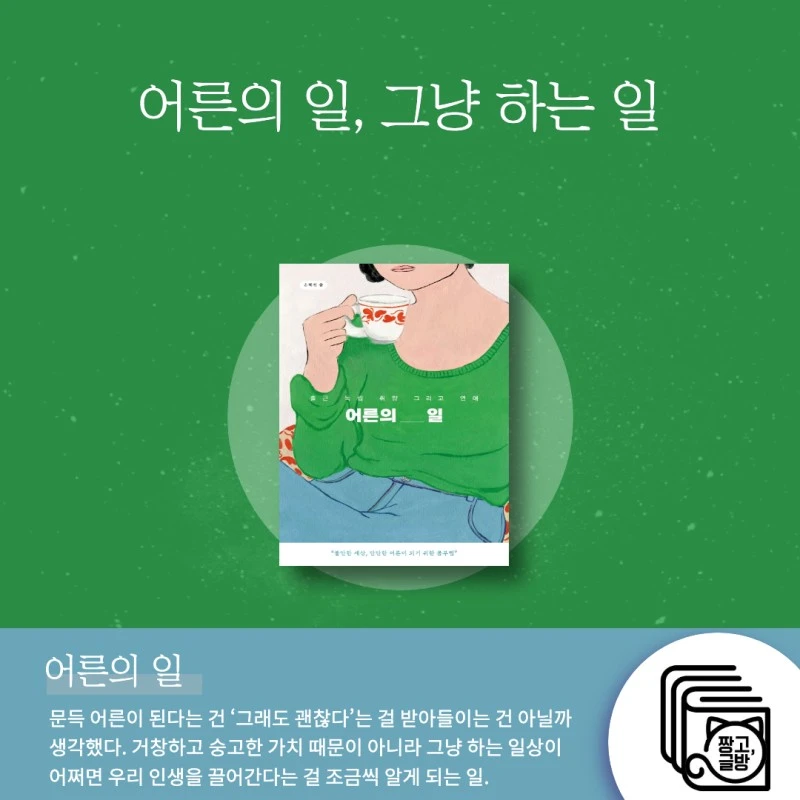 그러다 문득 어른이 된다는 건 ‘그래도 괜찮다’는 걸 받아들이는 건 아닐까 생각했다. 안하면 큰일 날 것 같던 그 것들이 사실 우리 삶의 아주 작은 부분이었음을 깨닫는 일, 하면 안된다고 그렇게 목소리를 높이던 것들도 사실 해보면 별거 아니란 걸 알게 되는 일. 거창하고 숭고한 가치 때문이 아니라 그냥 하는 일상이 어쩌면 우리 인생을 끌어간다는 걸 어설프지만 조금씩 알게 되는 일. 그렇게 지금도 글을 쓰고 밥을 먹고 삶을 영위하는 평범이 내 삶임을 인정하는 일.