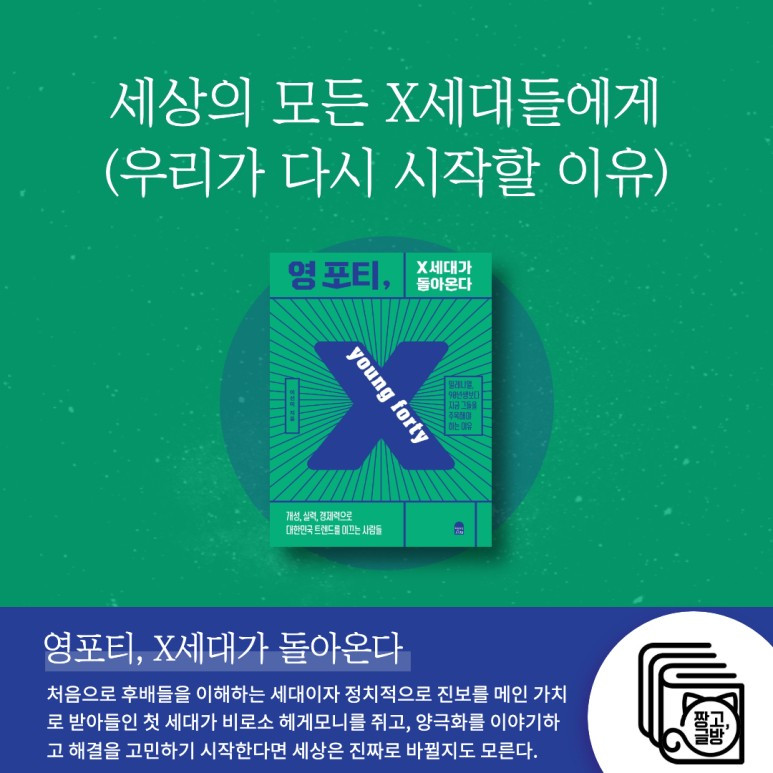 모두가 주된 소비 대상인 MZ세대를 이야기한다. 하지만 책은 마케팅을 소비하는 대상 이전에 그 콘텐츠를 만들어 내는, 이른바 대한민국의 중심에 선 X세대에 대해 함께 이야기해보자고 권한다. 처음으로 후배들을 이해하는 세대이자 정치적으로 진보를 메인 가치로 받아들인 첫 세대. 이 새로운 세대가 비로소 헤게모니를 쥐고, 양극화를 이야기하고 해결을 고민하기 시작한다면 세상은 진짜로 바뀔지도 모른다고 말한다. 지나간 시대의 막차가 아니라 새로운 시대의 첫차로의 역할을 오늘 감당할 수만 있다면 몰락해버린 어느 세대를 좇지 않고 이전에 없던 시대를 열어젖힐지도 모른다고 말한다. 마지막 장을 덮으며 가슴이 뛰었다.